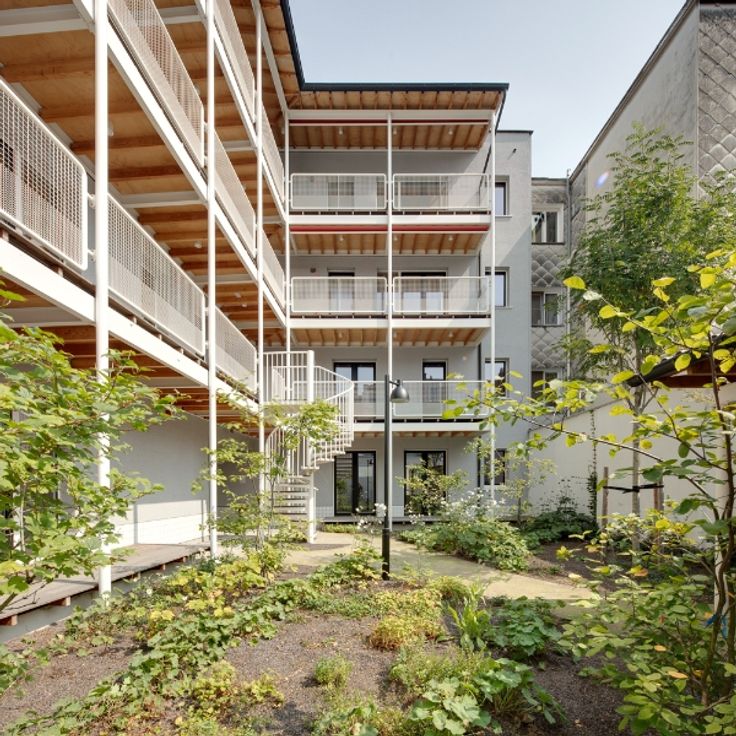 Dit appartement (128 m²) maakt deel uit van een woonproject met 7 wooneenheden. Een mooi aangelegde gemeenschappelijke binnentuin verbindt de appartementen met elkaar.