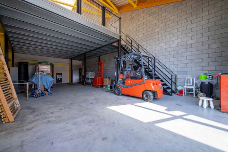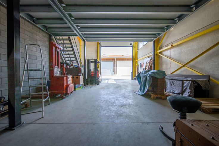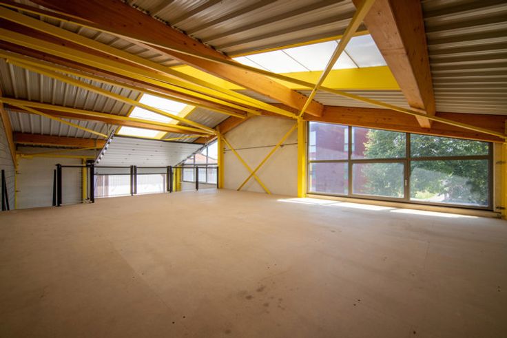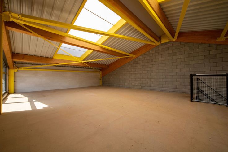 Het magazijn heeft een vloeroppervlakte GLV van 100m² met een makkelijk toegankelijke mezzanine van 67m² (polyvalante ruimte) voor bijkomende stockage of kantoren. De maximale hoogte nok bedraagt net geen 7,5m, onder de mezzanine 4m en boven ca.2m70.