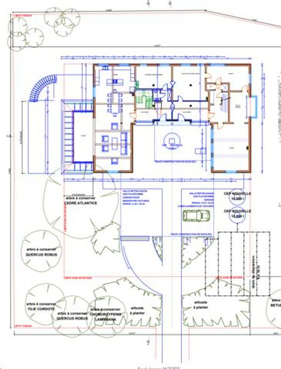 Aile gauche : Au rez-de-chaussée : Hall d'entrée avec WC séparé, beau séjour de 50m² avec accès au jardin orienté S-E, vaste cuisine séparée avec accès vers l'extérieur également, bureau, accès sous-sols et garages.