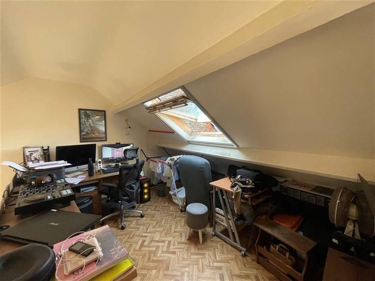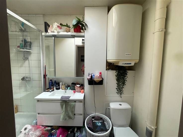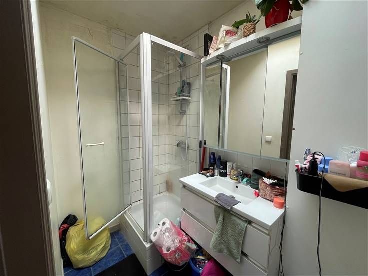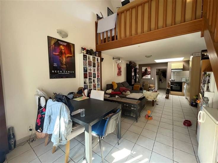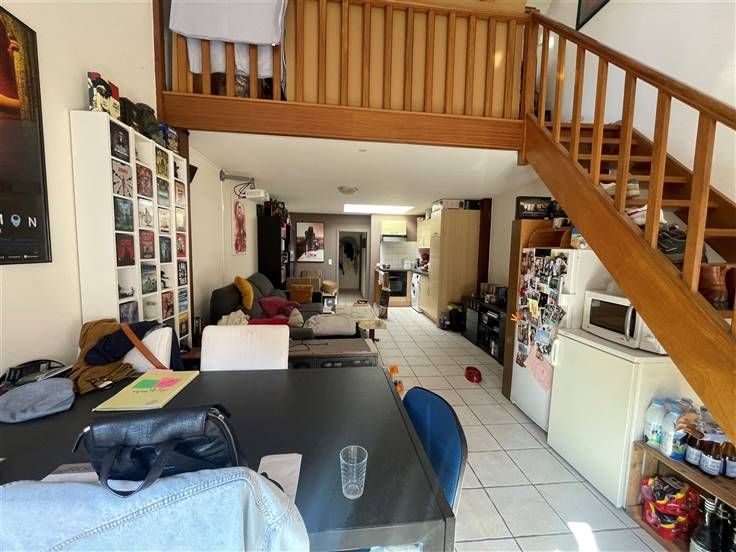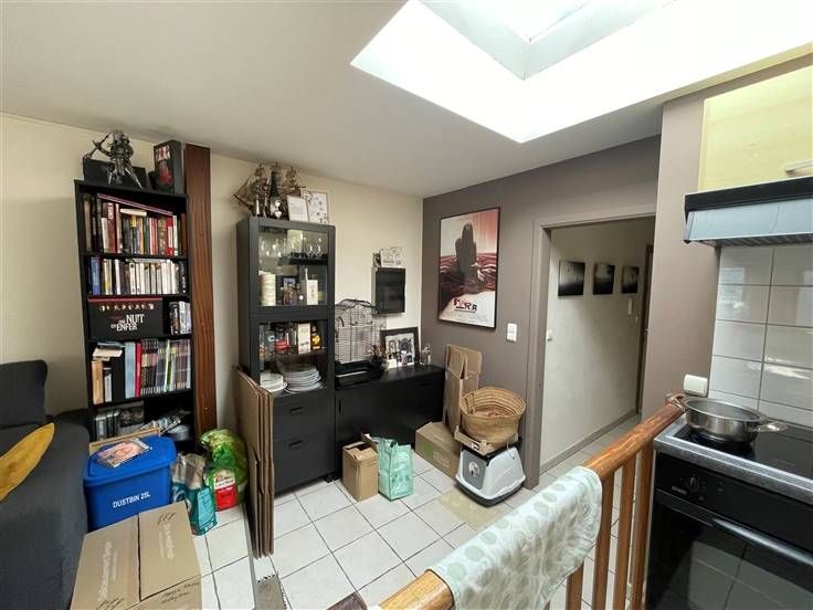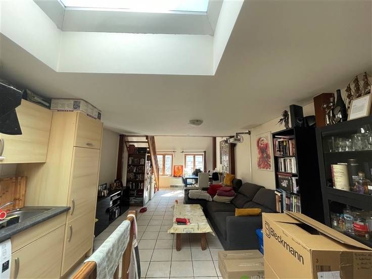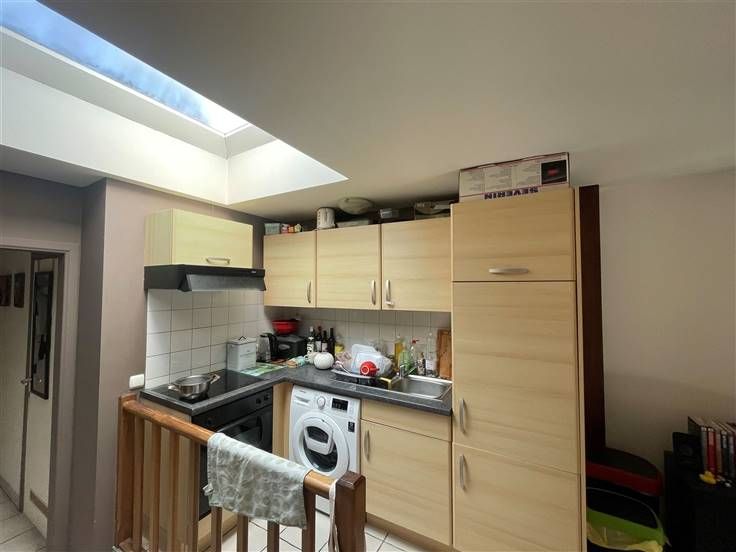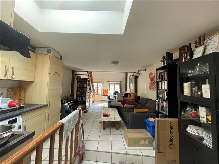 2 ème étage : Hall d'entrée (+/- 3 m²), living avec coin cuisine équipée évier simple bacs - taques électriques - hotte - four - frigo - emplacement lave-vaisselle (+/- 31 m²), salle de douche avec WC (+/- 4 m²), 2 chambres dont une en mezzanine (+/-9 et 9,50 m²),