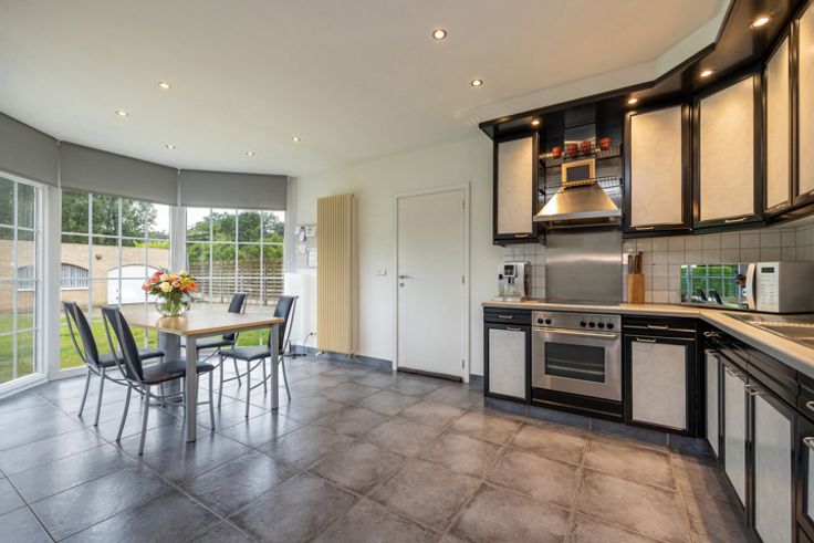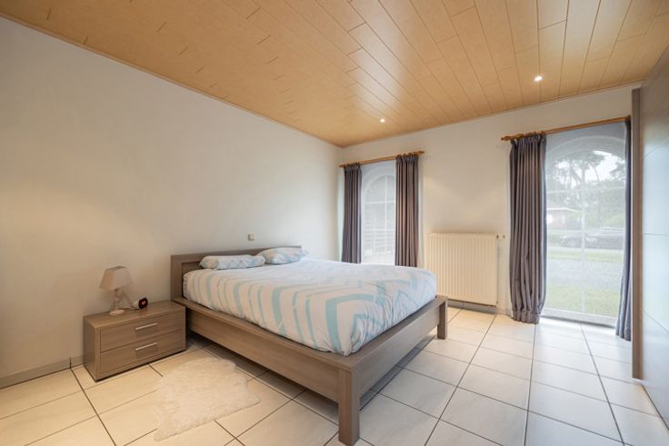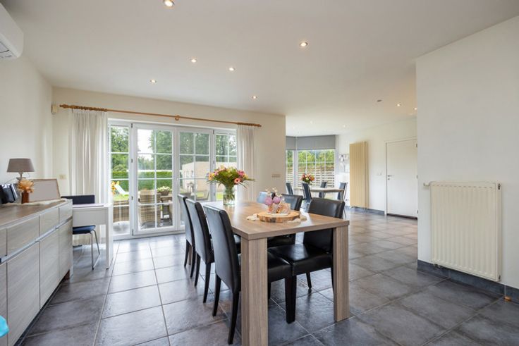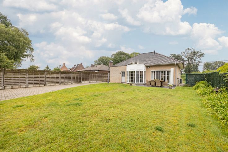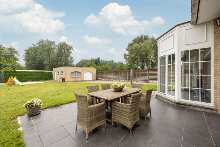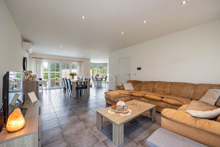 GELIJKVLOERS Ruime inkomhal ca.11m² op keramische tegel. Lichtrijke leefruimte ca.35m² op tegel voorzien van airco en screens achteraan. Open keuken ca.16m² op tegel voorzien van dubbele spoelbak, keramische kookplaat, oven en ingebouwde koelkast. Slaapkamer ca.19m² op tegel. Badkamer met ligbad en lavabo en apart toilet. Wasplaats/berging 1 STE VERDIEPING 2 ruime slaapkamers beide ca.24m², voorzien van airco. Apart toilet. BIJGEBOUW Achteraan op het perceel ligt de garage, deze was vroeger ingericht als woonst. BIJZONDERHEDEN Cv op gas (recente condensatieketel 2021) en airco met mogelijkheid tot verwarming. Gunstig EPC.  POSITIEVE ASPECTEN Rustige, groene woonligging Instapklare lichtrijke woning Zuid-west orientatie 3 ruime slaapkamers Airco