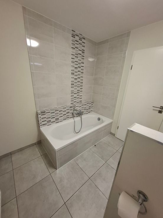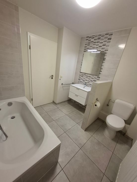 une salle de bains (baignoire, lavabo, wc)