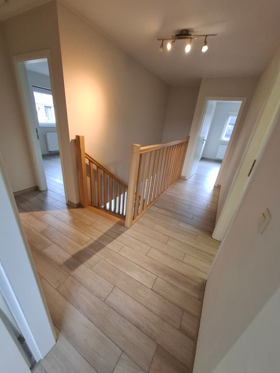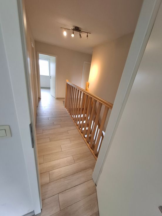 - Rez de chaussée : hall d’entrée, toilette, garage (porte autom.) avec espace