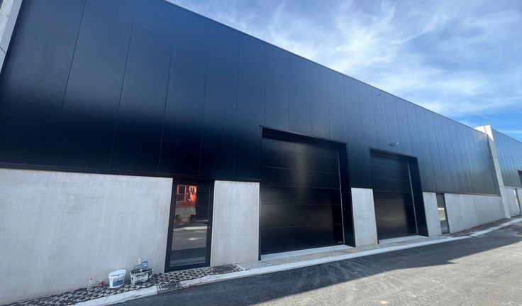 Specificaties: staalstructuur, gevel in architectonisch beton en aluminium sandwichpanelen, 1 automatische sectionale poort per unit 4m x 4m, 6m vrije hoogte, polybetonvloer met draagkracht 2T/m², geïsoleerd steeldeck dak met lichtstraat, afvoer sanitair, 32A, septische put 2000l en regenwaterput 3000l per unit, fietsenstalling met 2 laadpunten, 1 parking per unit met wachtbuis voor laadinfrastructuur