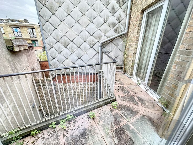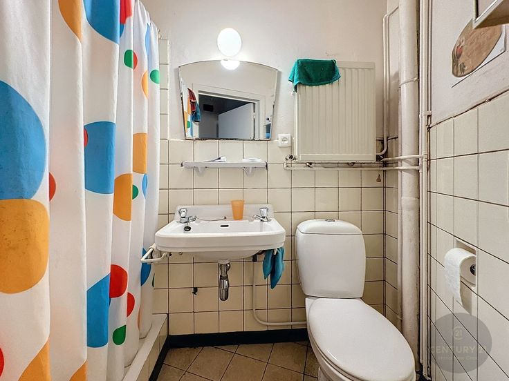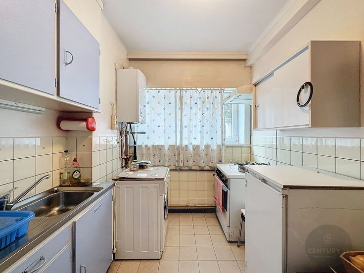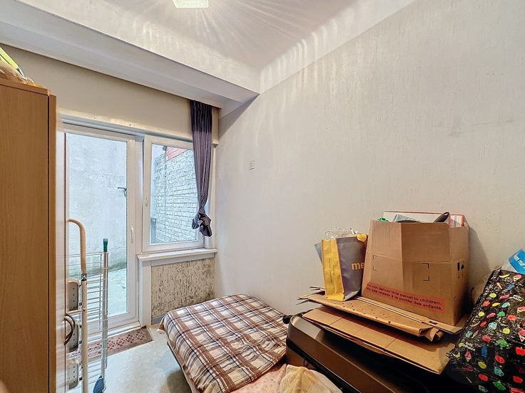 Algemene inkomhal met trap, voordeur naar gelijkvloers appartement, inkomhal, badkamer, afzonderlijke keuken, lichtrijke woonkamer, 2 slaapkamers, stadskoer.