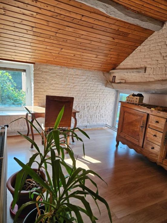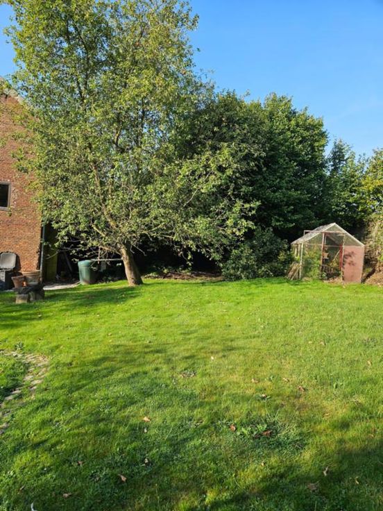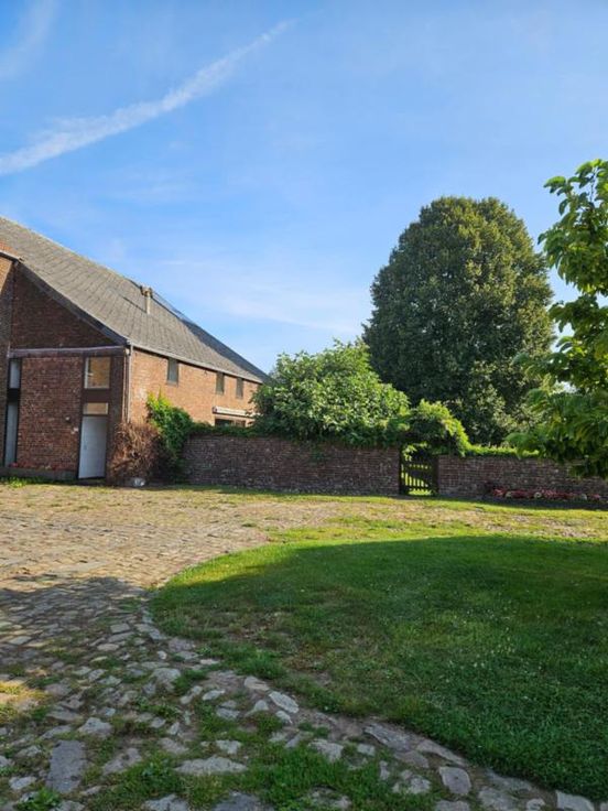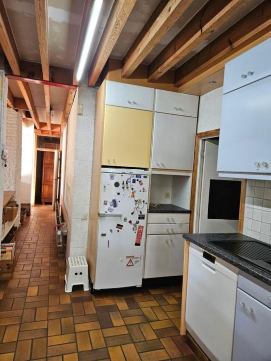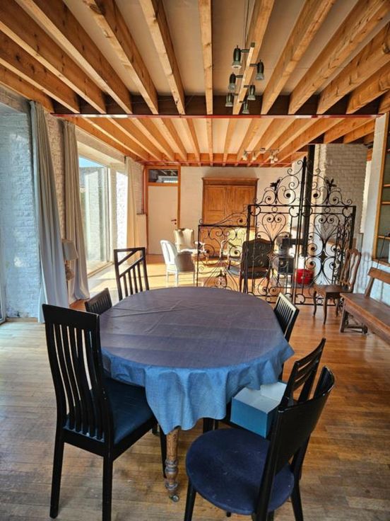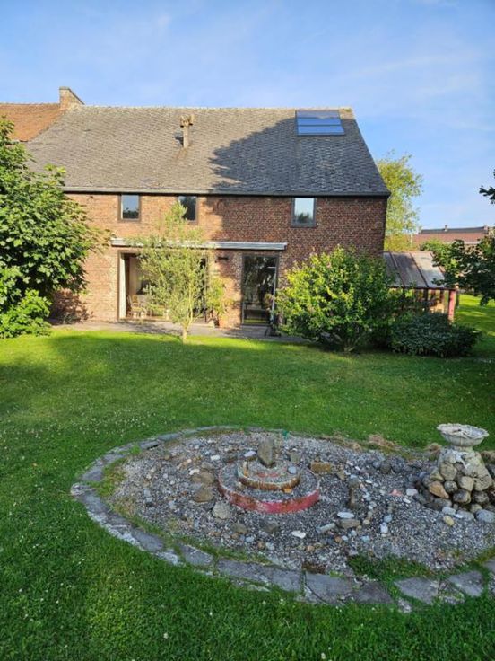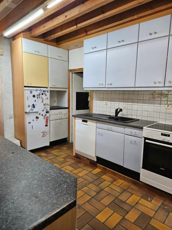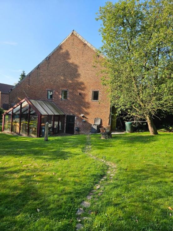 Ce bien se compose au rez: hall d'entrée avec wc, très grand living avec cuisine ouverte, 2 autres pièces pouvant servir de salle de télévision, véranda, partie grange à aménager; à l'étage : palier, bureau, wc, 4 chambres dont une avec point d'eau, salle de bains, salle de douche; Emplacement de parking couvert dans la cour commune (charges de 40€/mois pour cette cour). Chauffage central mazout, châssis DV en bois, fosse septique (surplus à l'égout), adoucisseur d'eau, alarme, panneaux solaires thermiques. Superficie : 14 a 16 ca - RC : 783 €.