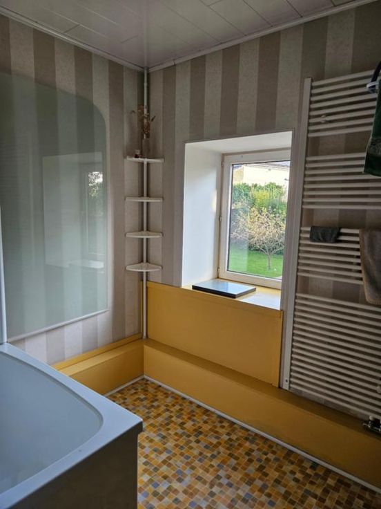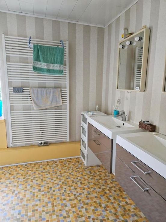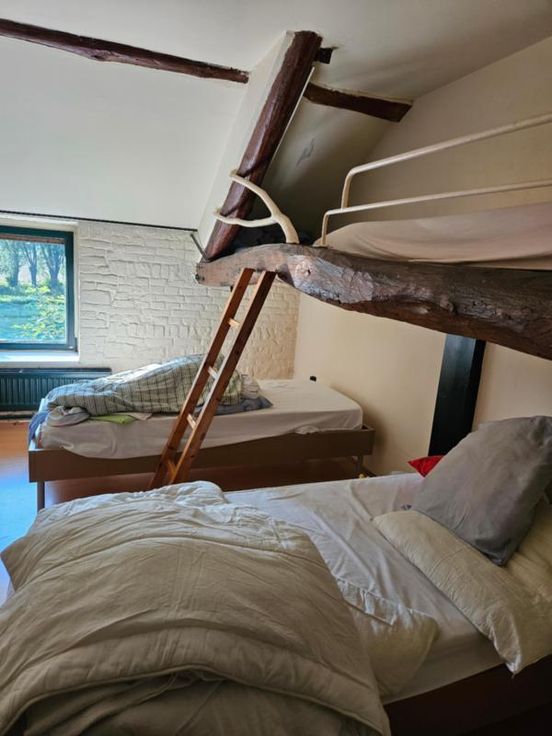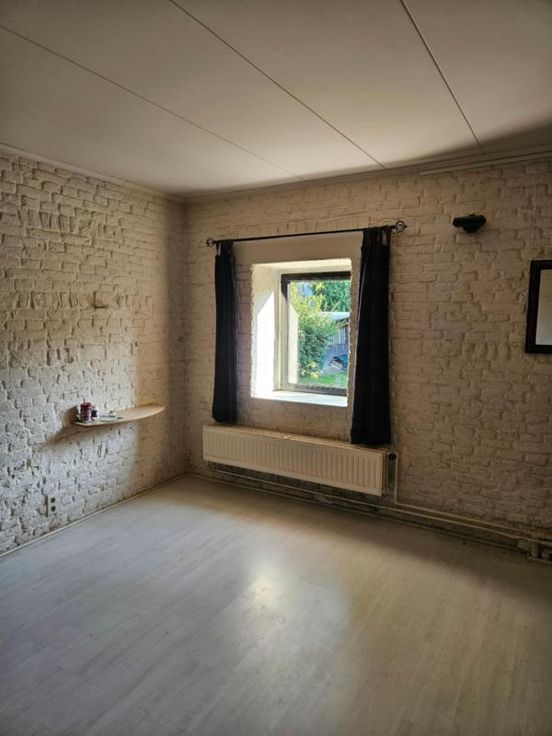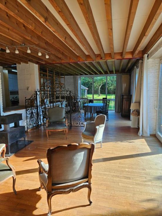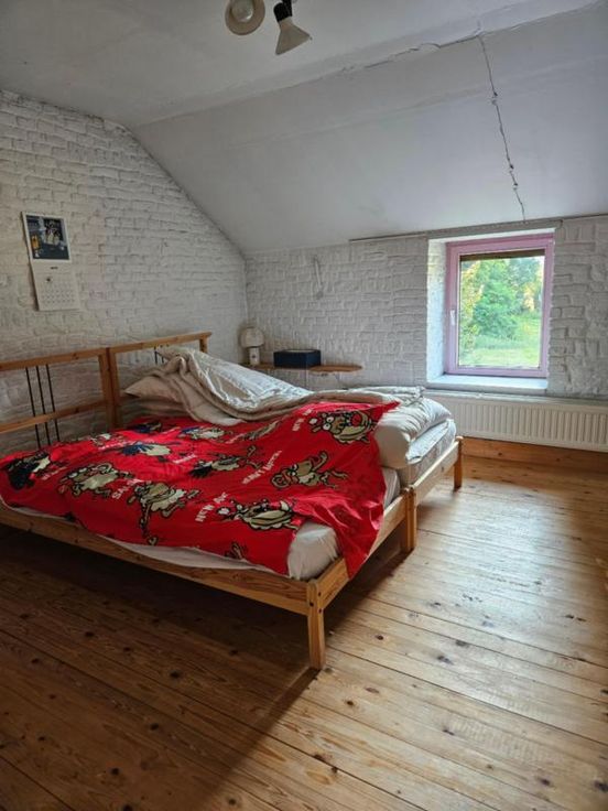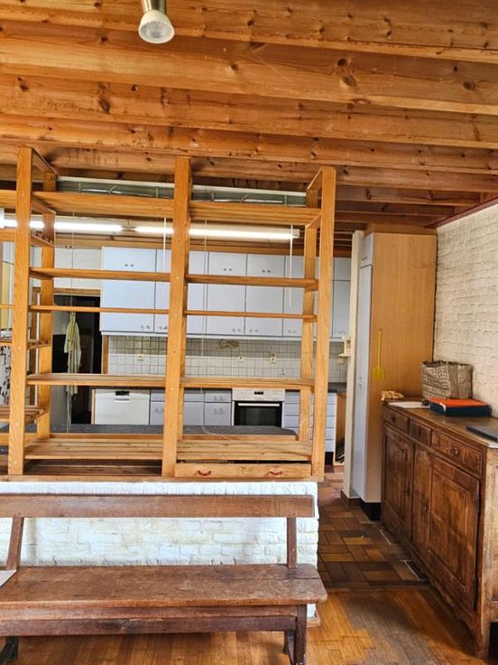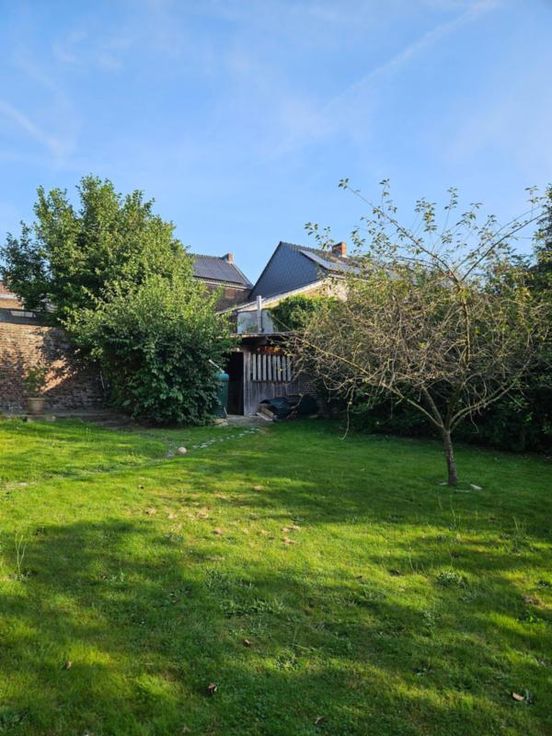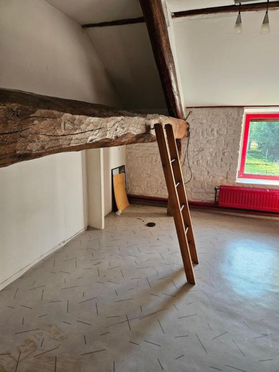Ce bien se compose au rez: hall d'entrée avec wc, très grand living avec cuisine ouverte, 2 autres pièces pouvant servir de salle de télévision, véranda, partie grange à aménager; à l'étage : palier, bureau, wc, 4 chambres dont une avec point d'eau, salle de bains, salle de douche; Emplacement de parking couvert dans la cour commune (charges de 40€/mois pour cette cour). Chauffage central mazout, châssis DV en bois, fosse septique (surplus à l'égout), adoucisseur d'eau, alarme, panneaux solaires thermiques. Superficie : 14 a 16 ca - RC : 783 €.