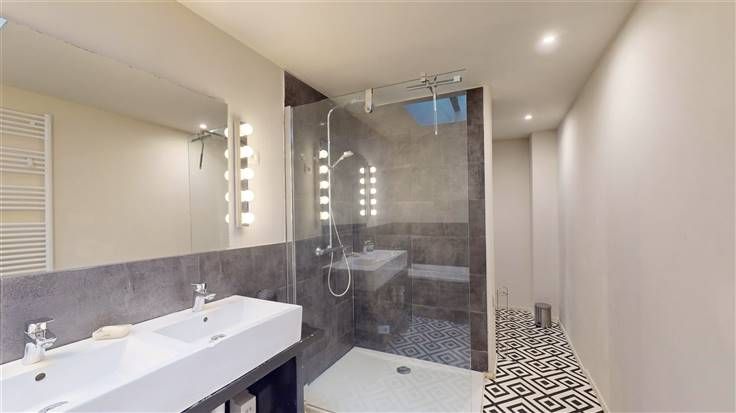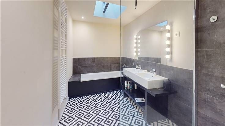1er étage : palier, lumineux living (+/-26 m²), salle de bains (+/-10 m², avec baignoire, douche, meuble lavabo, w.c. et radiateur sèche-serviettes).