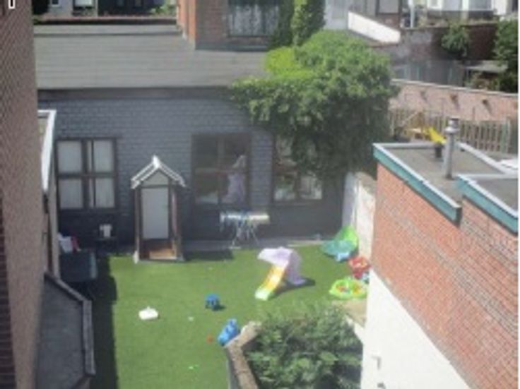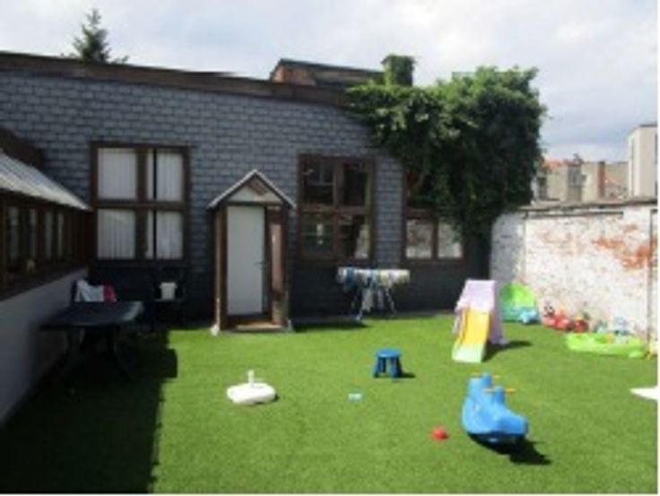 Tussen de doorgang en het gebouw is er een open ruimte ingericht als buitenspeeltuin.