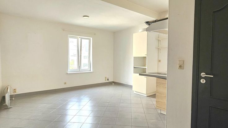 Leefruimte met open keuken en badkamer.