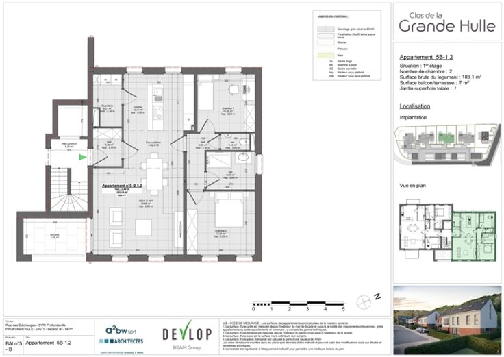 PROMOTION PRINTEMPS - 20.000 € DE REDUCTION SUR L'APPARTEMENT (*). PROFONDEVILLE – Dans un écrin de verdure, bel appartement contemporain (2CH/1SDB) de 103,10 m² situé au 1er étage de la résidence « Clos de la Hulle ». Il se compose d’une buanderie, d’un beau séjour avec accès une terrasse de 7,05 m² avec cuisine ouverte, un hall de nuit, une salle d’eau et 2 chambres. Vue verdoyante et dégagée. L’implantation dans un cadre de verdure permet une architecture ouverte sur le paysage offrant des vues sur un cadre naturel et paisible ; nombreuses possibilités de promenades. L’utilisation de pompes à chaleur géothermiques, de panneaux solaires thermiques et de panneaux photovoltaïques permet de fournir une énergie propre et durable à l’ensemble des résidents. Châssis double vitrage en PVC, excellente isolation acoustique et thermique. Double flux, cuisine équipée, vidéophone. Finitions soignées afin que le confort soit optimal. Parking et local de rangement en sus. PEB prévisionnel « A ». Vente sous régime TVA (21%) pour la construction et sous droits d'enregistrement (12,50%) sur le terrain. La Loi Breyne est d’application. Livraison prévue : septembre 2024. A deux pas des commodités et facilités. Idéal tant pour y habiter que pour y investir ! PRIX FIXES ET NON REVISABLES. A découvrir chez LP au 081/303 404. (*) réduction déjà appliquée sur le prix affiché.