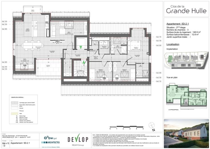 VENDU - PROFONDEVILLE – Dans un écrin de verdure, bel appartement « penthouse » contemporain (3CH/BUR/2SDB) de 147 m² situé au 2 ème étage de la résidence « Clos de la Hulle ». Il se compose d’une buanderie, d’un beau séjour avec accès à une terrasse de 9,63 m² avec cuisine ouverte, un hall de nuit, une salle d’eau et 3 chambres. Vue verdoyante et dégagée. L’implantation dans un cadre de verdure permet une architecture ouverte sur le paysage offrant des vues sur un cadre naturel et paisible ; nombreuses possibilités de promenades. L’utilisation de pompes à chaleur géothermiques, de panneaux solaires thermiques et de panneaux photovoltaïques permet de fournir une énergie propre et durable à l’ensemble des résidents. Châssis double vitrage en PVC, excellente isolation acoustique et thermique. Double flux, cuisine équipée, vidéophone. Finitions soignées afin que le confort soit optimal. Parking et local de rangement en sus. PEB prévisionnel « A ». Vente sous régime TVA (21%) pour la construction et sous droits d'enregistrement (12,50%) sur le terrain. La Loi Breyne est d’application. Livraison prévue : septembre 2024. A deux pas des commodités et facilités. Idéal tant pour y habiter que pour y investir ! PRIX FIXES ET NON REVISABLES. A découvrir chez LP au 081/303 404.