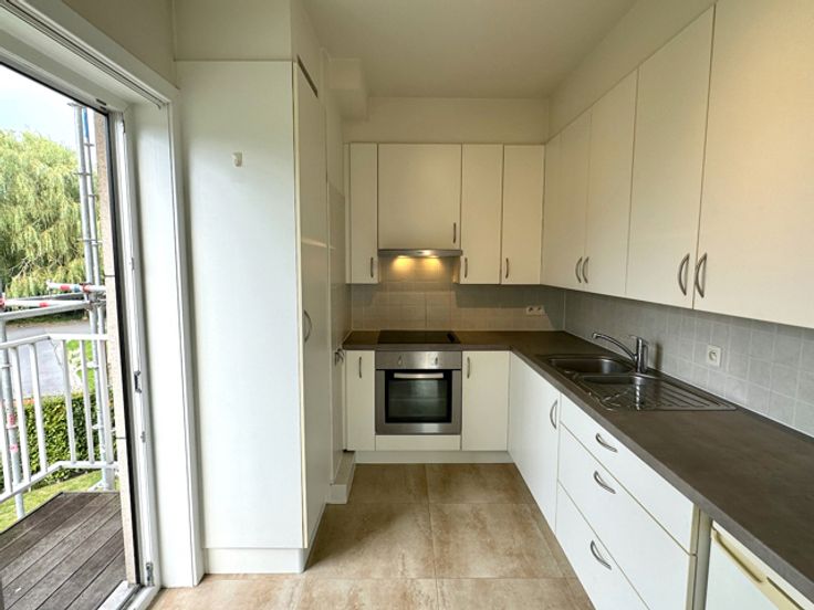 ENERGIEZUINIG HOEKAPPARTEMENT (1°V) met GESLOTEN GARAGEBOX op goede ligging nabij het bruisende centrum van Oostkamp en met een vlotte bereikbaarheid naar de autosnelweg E40/E403. Indeling: inkomhal met gastentoilet. RUIME & LICHTRIJKE LEEFRUIMTE met balkon, halfopen ingerichte keuken met terrasje. Ruime slaapkamer met terras achteraan. Bureau/dressing. Badkamer met ligbad/stortbad en aansluiting voor de wasmachine. CV op aardgas, epc 200 kWh/m2, label B, uc 20230210-0002807167-RES-1. De gesloten garagebox bevindt zich achter het gebouw. Maandelijkse huurprijs: € 750,- (inclusief garage en gemeenschappelijk kosten). Onmiddellijk beschikbaar !!!