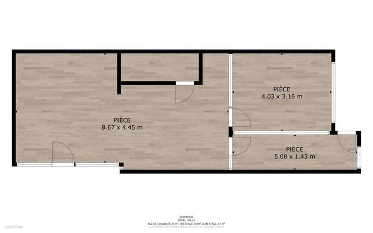 Aménagement : Deux bureaux séparés, une salle de réunion et un WC.