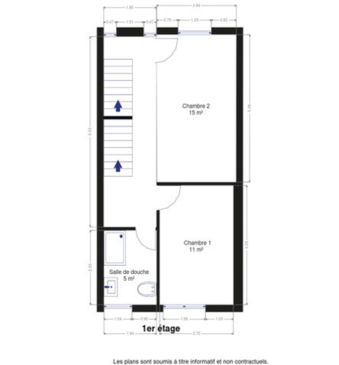 Etage 1: Hall de nuit, Chambre 1, Chambre 2, salle de douche.