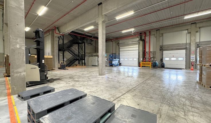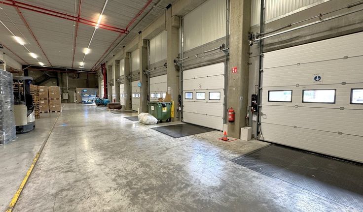 Specificaties: betonstructuur, 12,2m vrije hoogte, polybetonvloer, 1 automatische sectionale poort van 4,5m x 4,5m, 11 laadkades, lichtkoepels, tl-armaturen, hoogspanningscabine, zonnepanelen op dak, sprinklers en brandblussers, afgesloten site