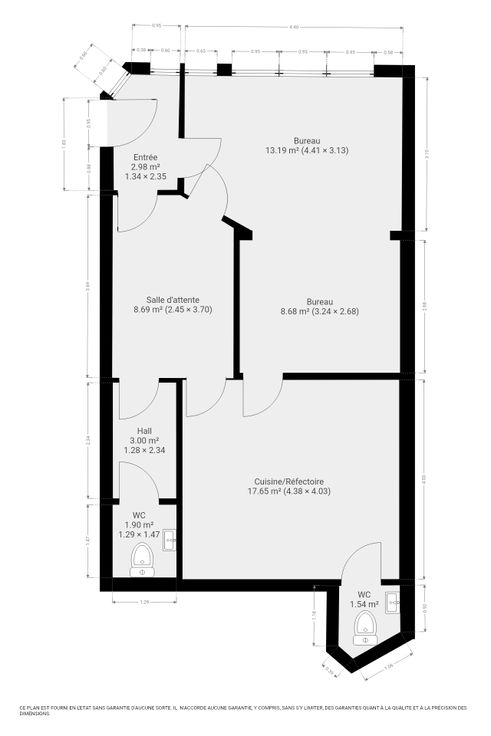 COMPOSITION : entrée, salle d’attente, espace bureaux/cabinet, cuisine avec réfectoire, réserve, wc privé et wc visiteur.