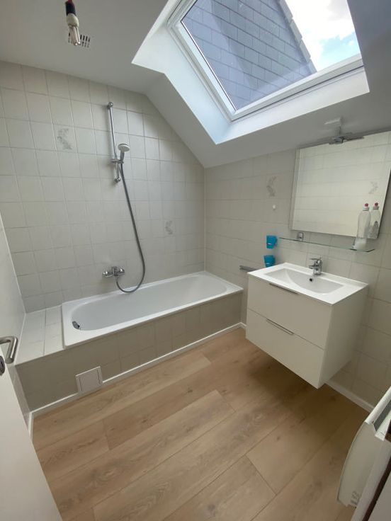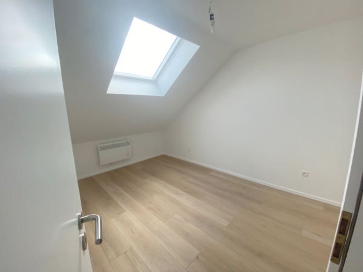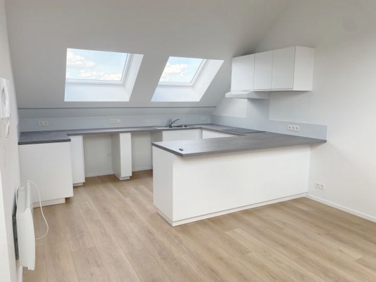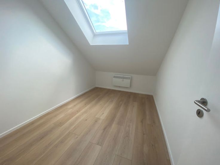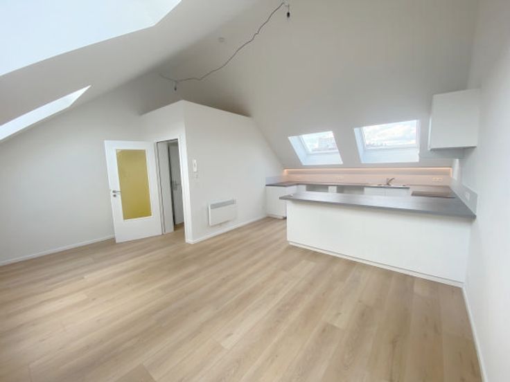 Dans un petit immeuble situé a proximité de la maison communale d'Evere magnifique appartement 2 chambres sous toiture complètement rénové avec une toiture isolée en 24 cm nouveau vélux avec excellent coefficient, se composant d'un hall d'entrée donnant sur un séjour de 29m2 plus une nouvelle cuisine hyper équipée Américaine (ouverte), hall de nuit donnant sur un bureau de 5m2, une première chambre de 10m2 et une seconde de 14m2, une toilette séparée, une salle de bain, en sous sol une cave PEB en cour les charges comprennent une provision d'eau et les communs