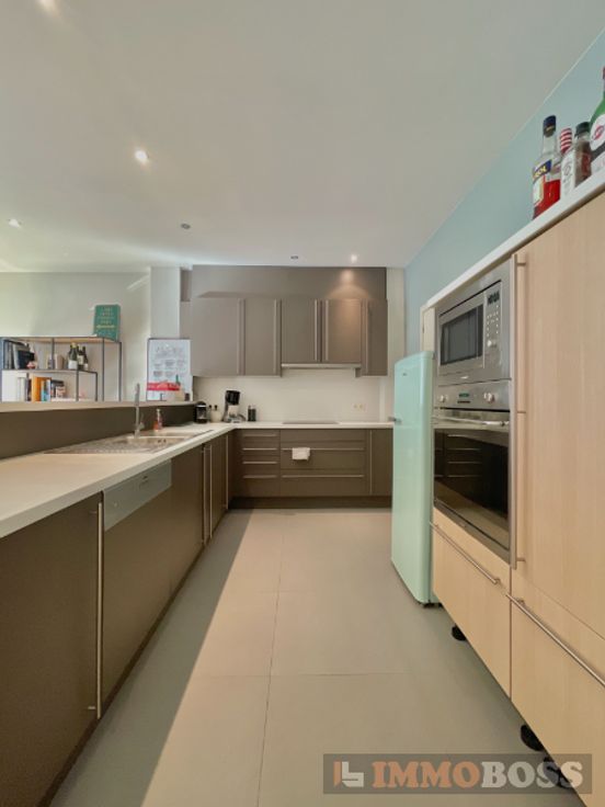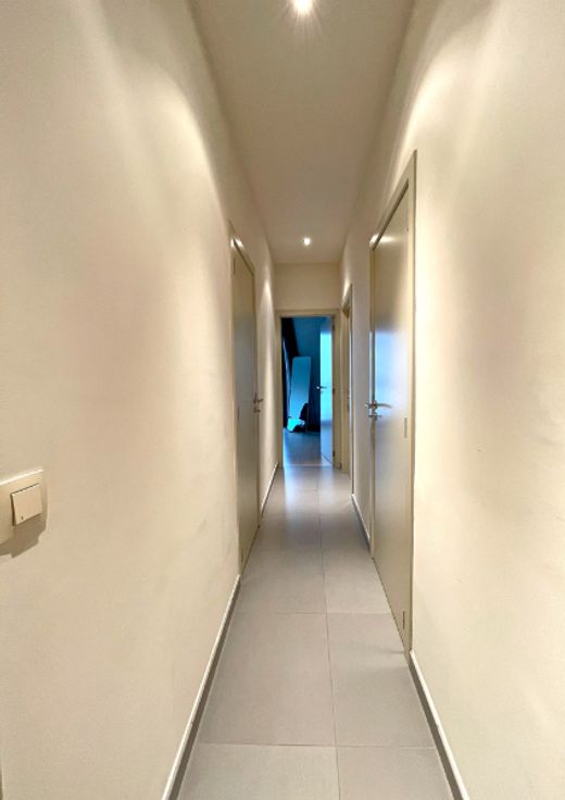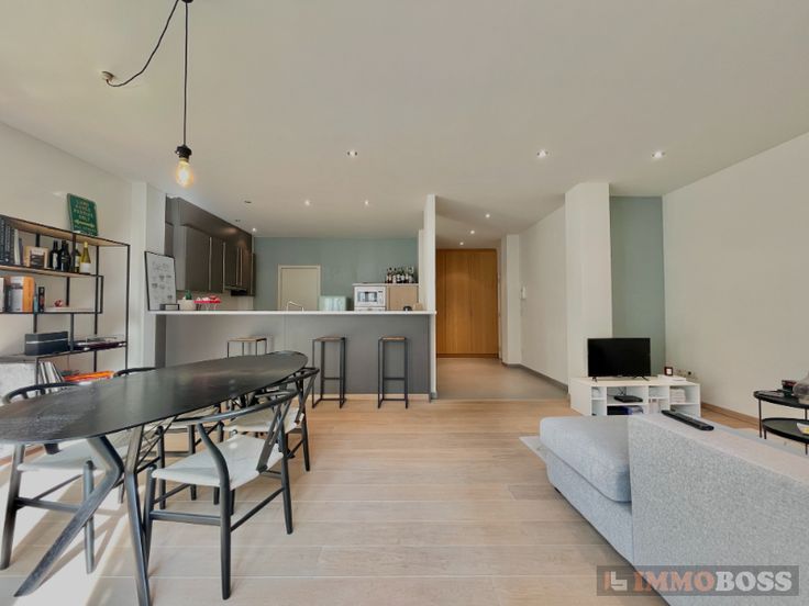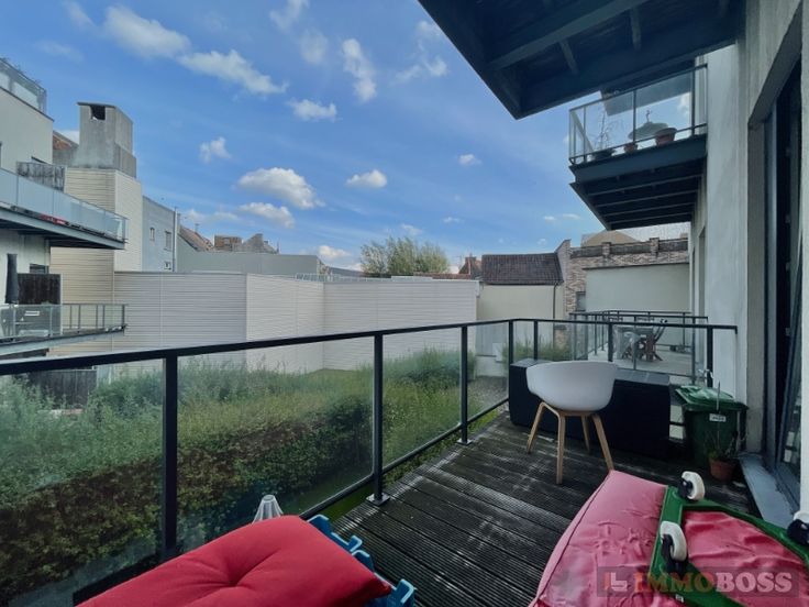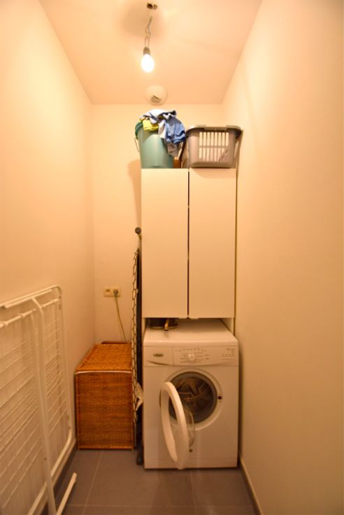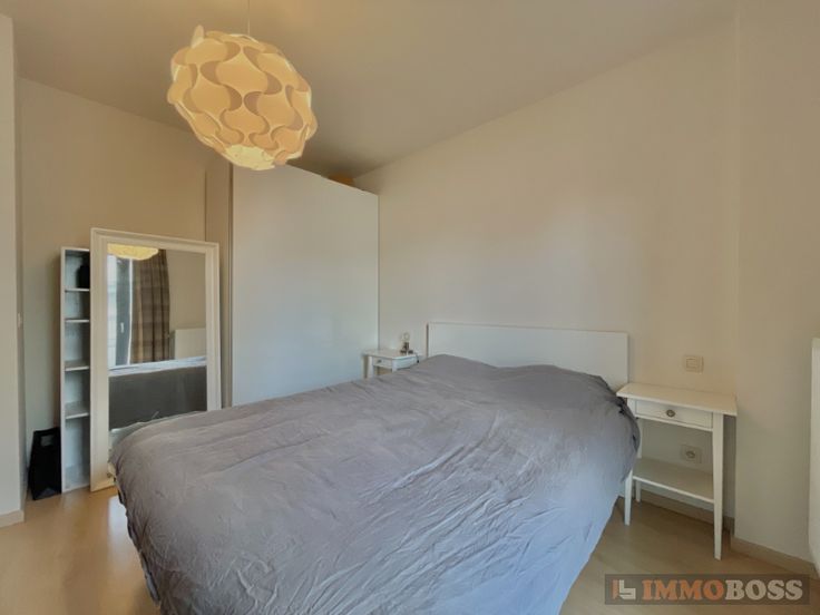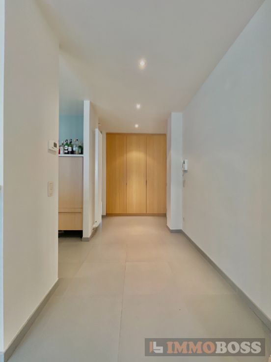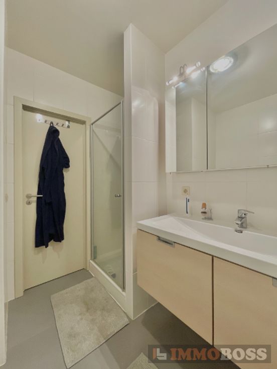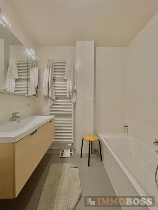 Het appartement omvat: inkomhal met parlofonie en ingemaakte vestiairekast (8m²), ruime leefruimte (30m²), ingerichte keuken (10m² - microgolfoven, oven, vaatwas), berging (3m²), 2 aangename slaapkamers (13m² en 15m²) en toegang tot een zonnig terras (8m²), ingerichte badkamer (6m²) met een bad, lavabo en inloopdouche, 2de berging met aansluiting voor wasmachine (2m²), apart toilet, kelder en autostaanplaats.