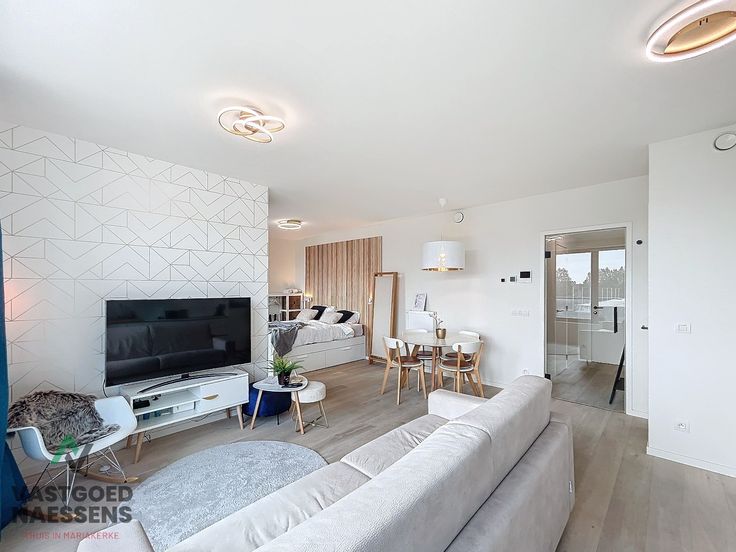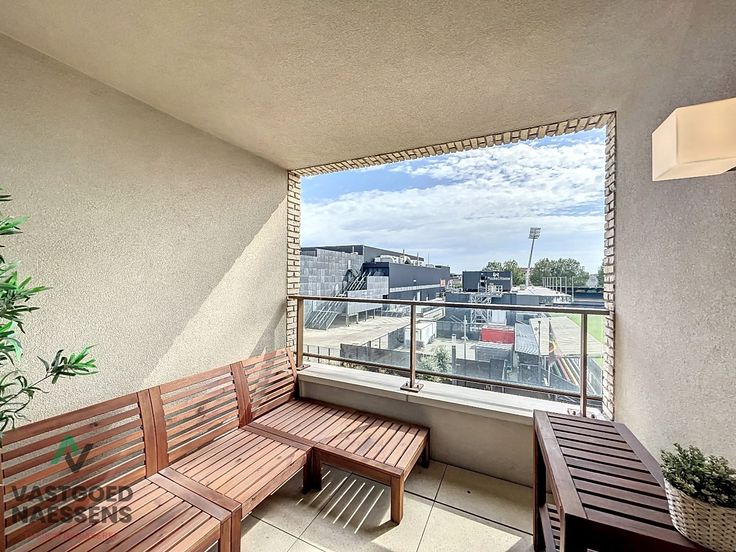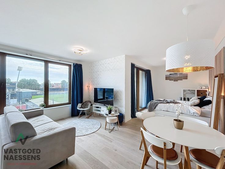 Bij het betreden van de studio komt men in de inkomhal die toegang geeft tot een apart toilet en de berging met aansluiting wasmachine. Verder is er een ruime woonkamer met een hyper-uitgeruste open keuken en een ruim terras die uitkijkt op de Diaz Arena. De badkamer is voorzien van een inloopdouche en een 'hotelhaardroger'. Bij de studio hoort tevens een autostandplaats (+ 100 euro / maand).