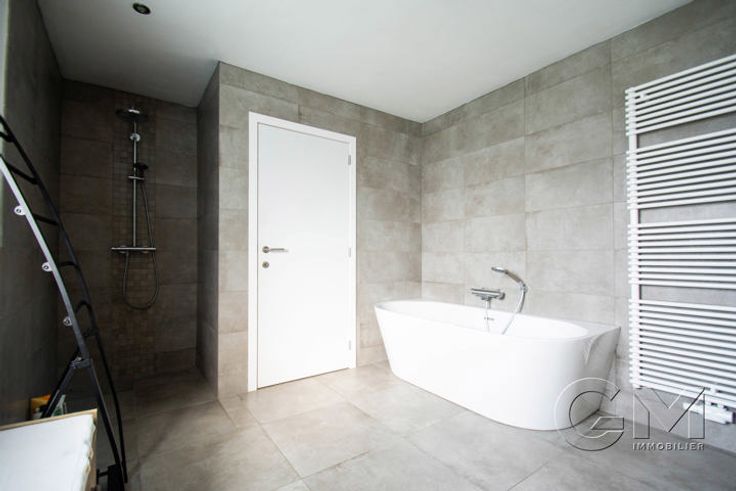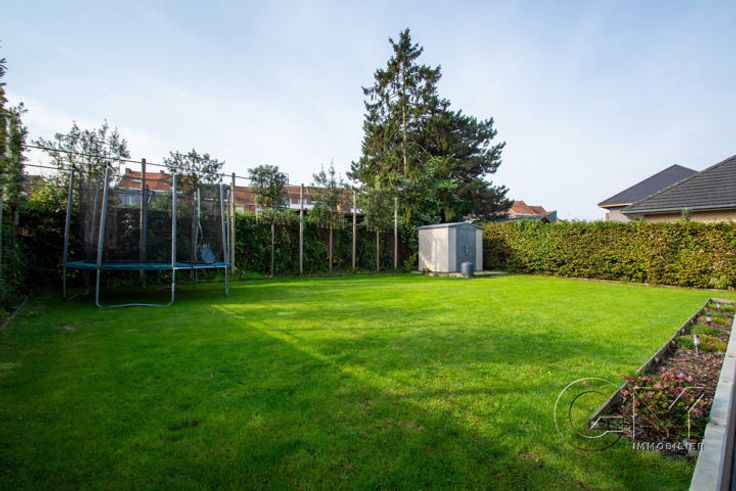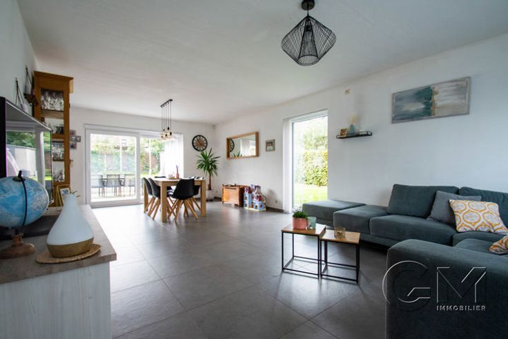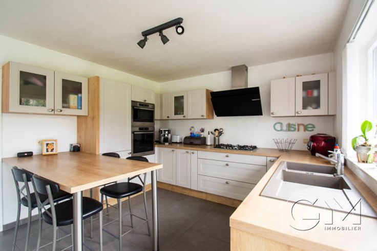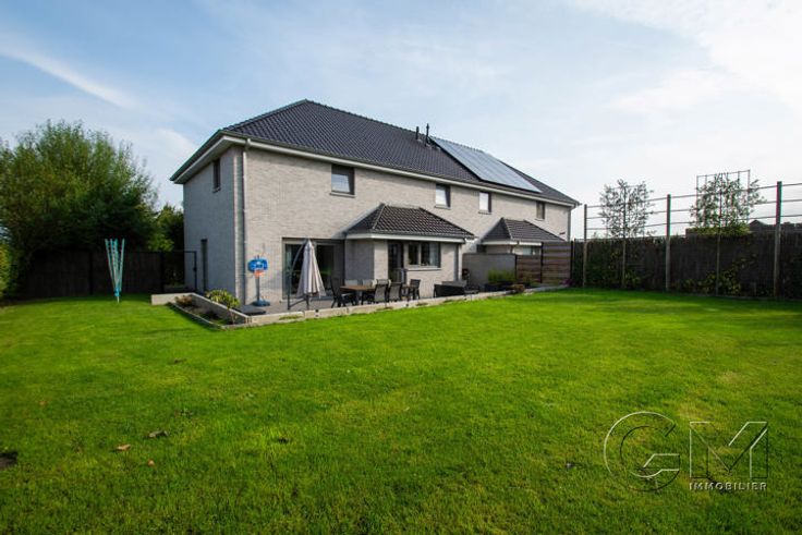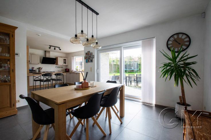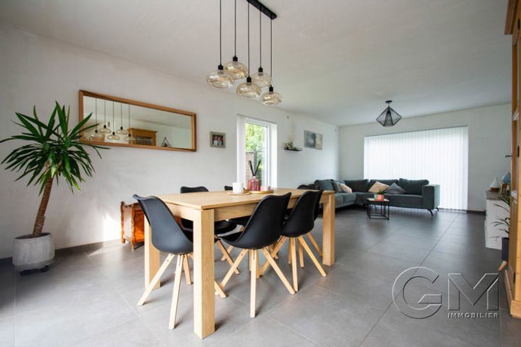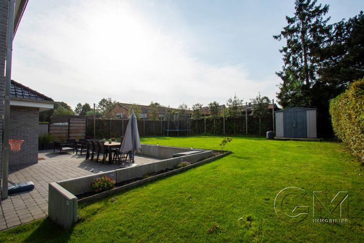 * Au rez-de-chaussée : Hall d'entrée avec escalier apparent et coin vestiaire, beau séjour avec espaces salon, salle à manger et cuisine full équipée (four, four micro-ondes, lave-vaisselle, frigo, taque au gaz, hotte, double évier et mobilier de rangement) avec coin repas, cellier, WC séparé, garage avec espace buanderie, parking privé à l'avant, grande terrasse et beau jardin entièrement clôturé, avec accès latéral.
