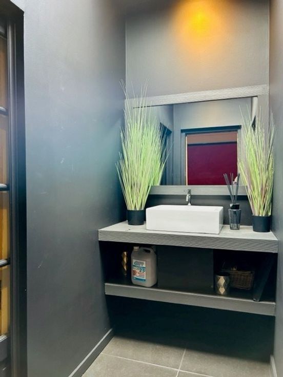 Au premier étage de la maison, il y a 2 espaces salon, un bureau et les WC. Il y a une terrasse.