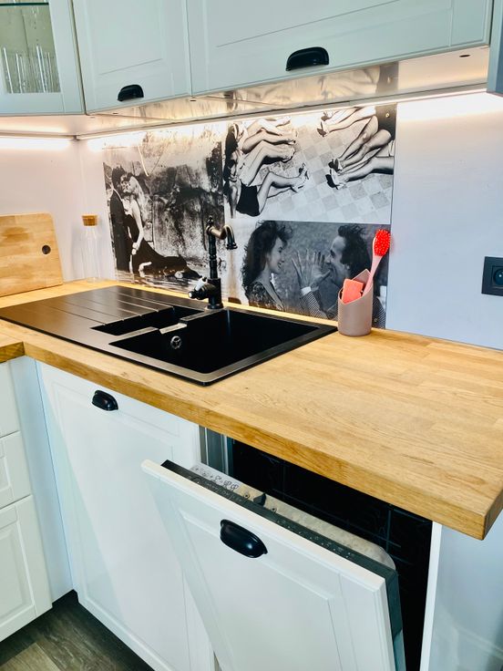 Beau séjour (salon et salle à manger) avec cuisine U.S.A. super équipée, une chambre avec literie de qualité avec salle de douche attenante et accès à la grande terrasse privative orientée Sud-Est.