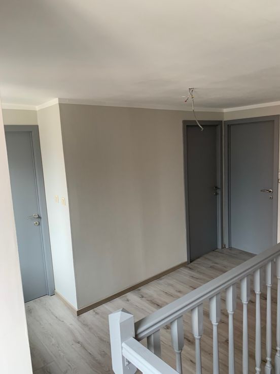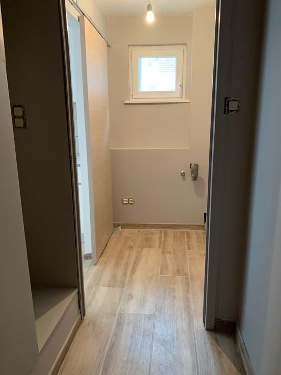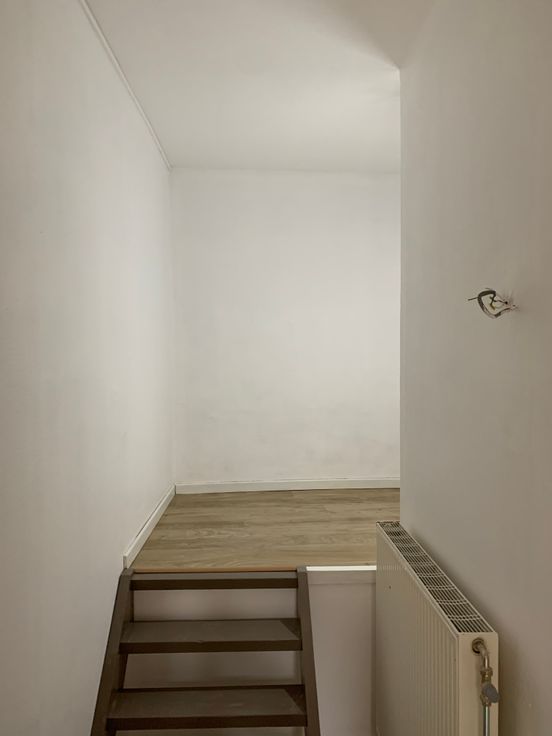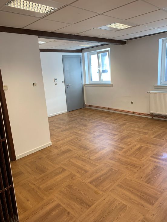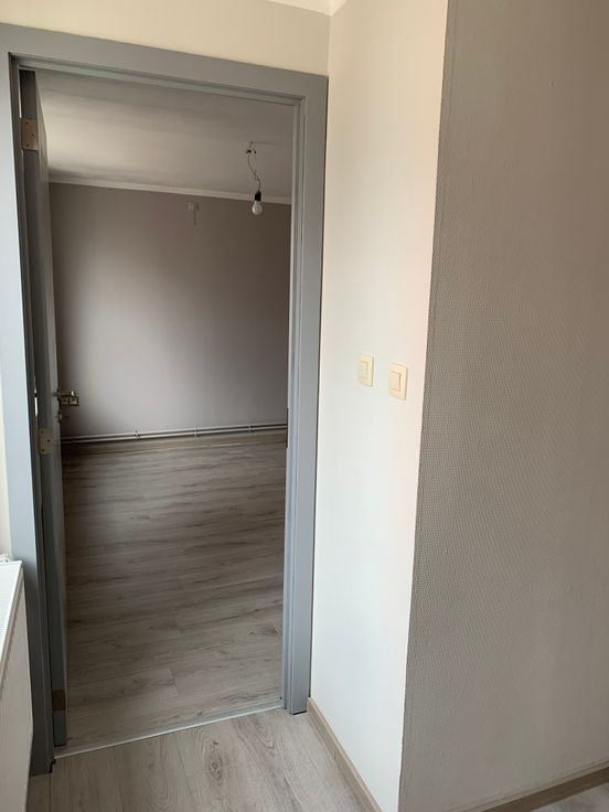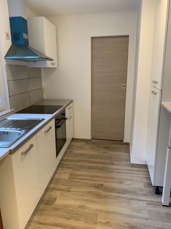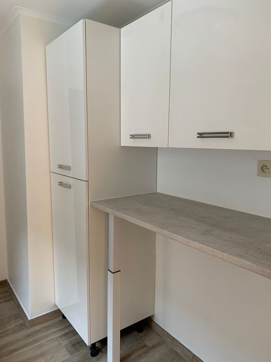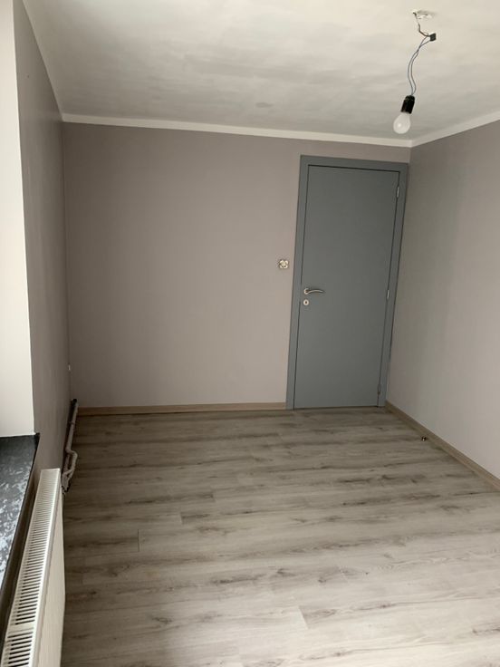 Rez de chaussée : hall d’entrée et débarras (local technique). 1er étage : living très lumineux, buanderie et cuisine neuve, équipée (taque vitrocéramique, four, frigo, hotte, lave-vaisselle).