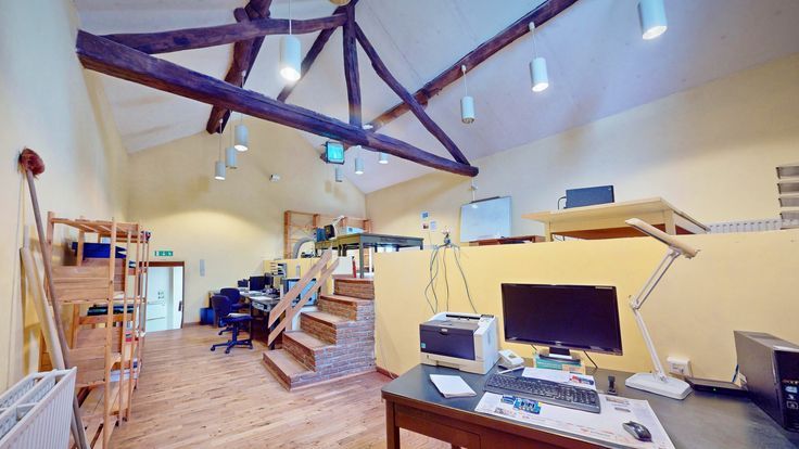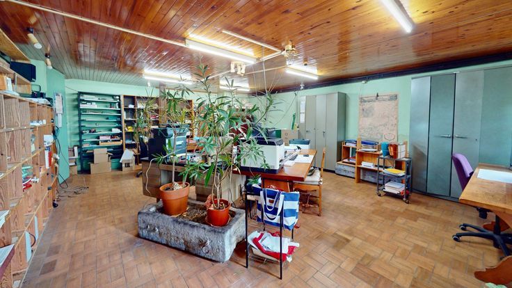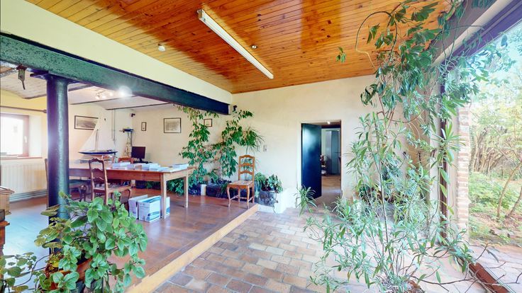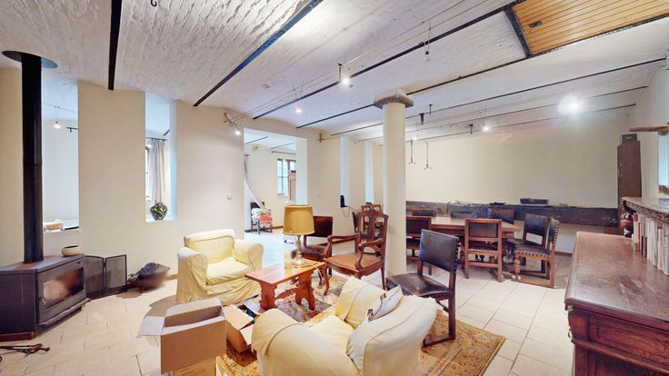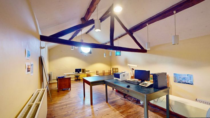 (2) Partie professionnelle - Rez-de-chaussée : réception avec salle de réunion sous voussettes, cafétéria, toilette, vastes espaces de bureaux, salle d'archives. Aux étages : vestibule, chambre avec armoire intégrée, wc, salle de bain, grenier et grands espaces aménageables, combles de rangement. En sous-sol : grande cave voûtée. Annexes : rem…