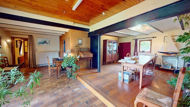 (1) Partie habitation - Rez-de-chaussée : hall d'entrée avec vestiaire, salle à manger avec cheminée et placard intégré, cuisine meublée, salon avec cheminée, salon TV en demi-niveau, toilette, grand local polyvalent et chaufferie. Aux étages : hall de nuit avec espace bureau, salle de douches, 3 chambres, salle d'eau avec wc, grenier aménageable, combles de rangement. En sous-sol : une cave voûtée. Dépendances : vaste grange aérienne, appentis et remises. Extérieurs : terrasse et jardin.