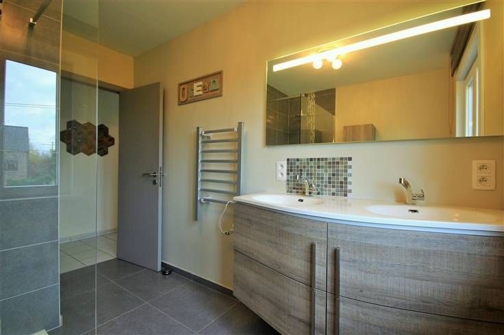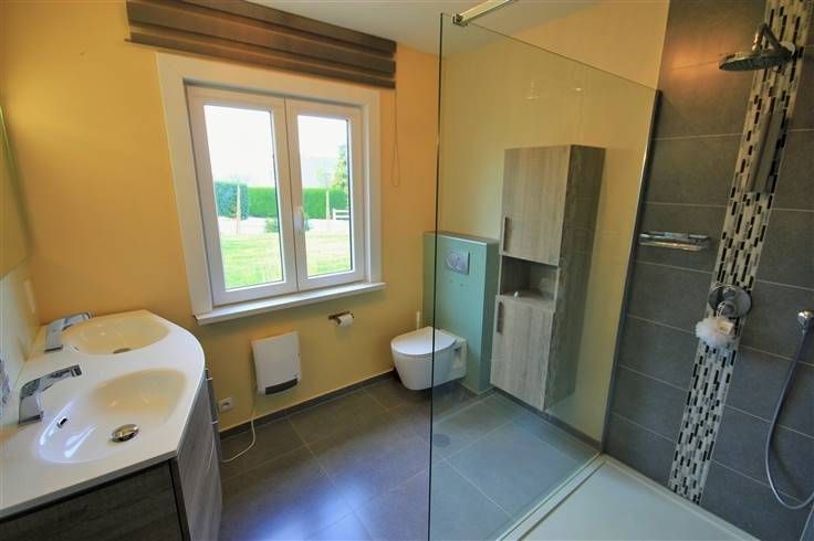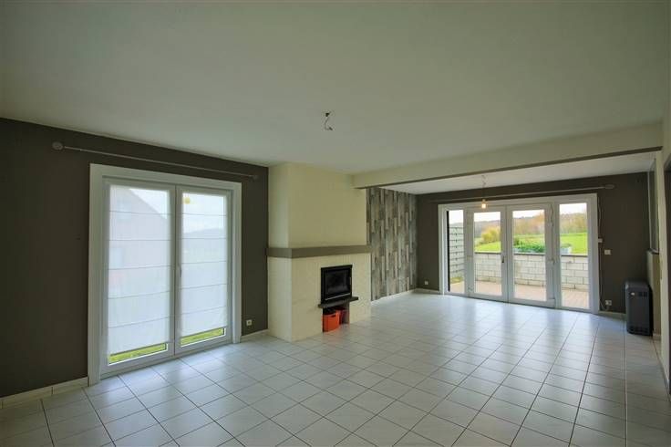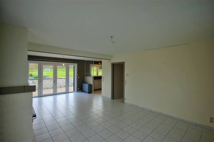 Elle se compose comme suit : vaste hall d’entrée, avec WC séparé, desservant d’une part, un grand séjour avec K7 à bois et accès vers les extérieurs, une cuisine semi-ouverte équipée (taque vitro, hotte et four) et une buanderie.