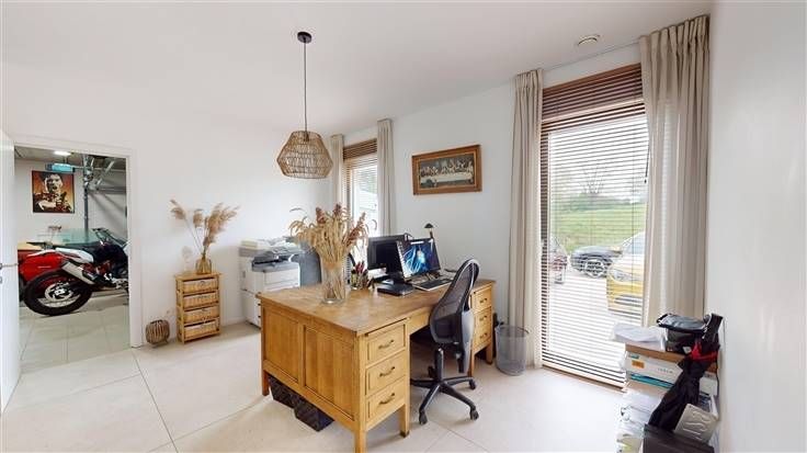 Rez : entrée (+/-16 m²), w.c. (+/-1,5 m²), séjour avec feu ouvert (+/-48 m²) ouvert sur la cuisine équipée (+/-21 m², taque à induction, four, hotte, lave-vaisselle, plan de travail DEKTON, meubles), pièce bureau (+/-16 m²), garage (+/-37 m²).