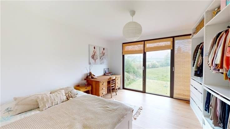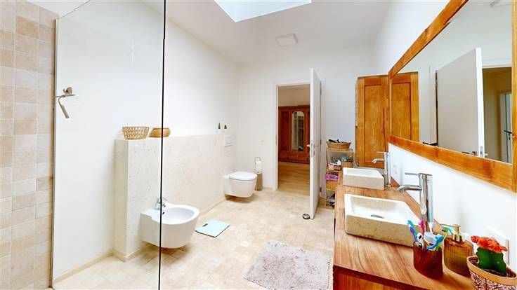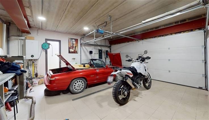 Equipements : chauffage au sol (rez) et radiateurs (étage) (chaudière gaz Bosch, avec prod. eau chaude sanitaire), ventilation double flux, alarme, citerne pluie (10.000 l) + groupe hydro, double vitrage alu, électricité conforme, sols carrelés (sauf chambres).