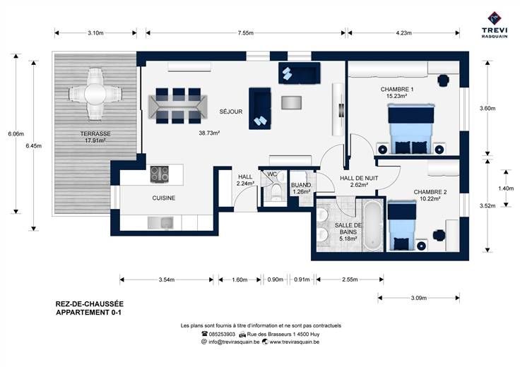 Sorry er is geen nederlandse vertaling beschikbaar. POSSIBILITE TVA à 6% !! Bénéficiant d'une situation unique, en bord de Meuse à Huy, Trevi Rasquain vous propose ce superbe rez-de-chaussée NEUF 2 ch (92 m²) situé dans une nouvelle Résidence de standing ! Il se compose comme suit : hall d'entrée, séjour de 40 m² avec cuisine équipée, hall de nuit, salle de douche, wc séparé, buanderie, 2 chambres (15 et 10 m²). Il dispose également d'une terrasse de 18 m² et un jardinet privatif. Cave et emplacement de parking extérieur (en supplément du prix affiché). APPARTEMENT VENDU ENTIEREMENT FINI !! Matériaux et équipements de qualité : PEB B, châssis dbl vitr. alu, chauff. centr. gaz de ville (chaudière à condensation), compteurs individuels, isolation (thermique et acoustique) performante. PLUS QUE 5 APPARTEMENTS DISPONIBLES !! LIVRAISON PREVUE OCTOBRE 2024. Photos indicatives, poss. carrelages/cuisine/sdb de coloris différents. Plans, informations et prix détaillé via l'agence.