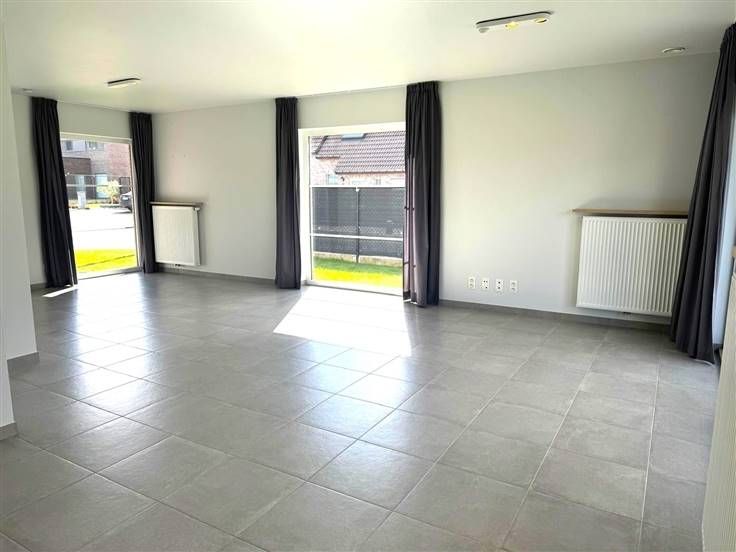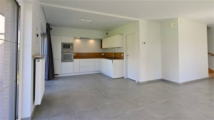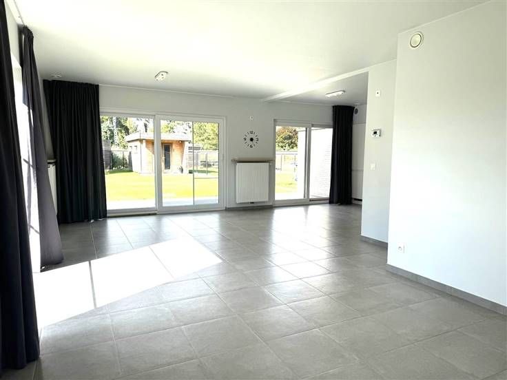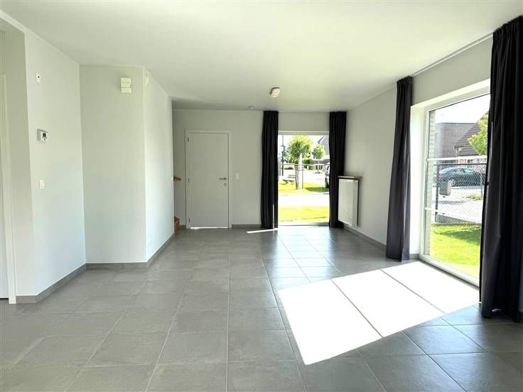 Bij het binnenkomen valt meteen de lichte, open leefruimte op, dankzij de grote ramen die het hele huis overspoelen met natuurlijk licht. De strakke tegelvloer zorgt niet alleen voor een moderne uitstraling, maar is ook nog eens heel praktisch in onderhoud. Aansluitend vind je de volledig uitgeruste keuken, voorzien van alle moderne apparatuur en voldoende kastruimte om al je spullen netjes op te bergen.