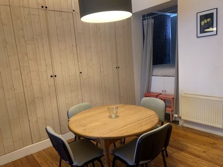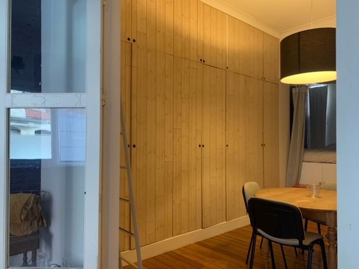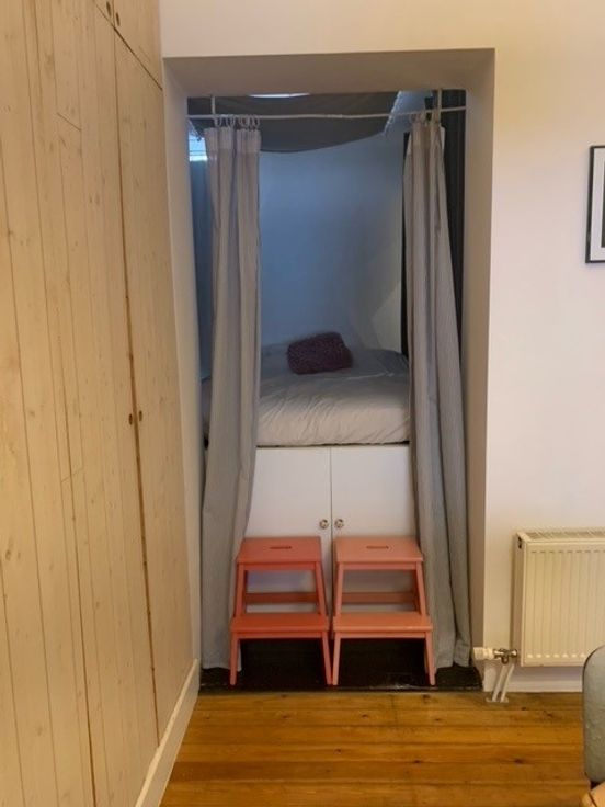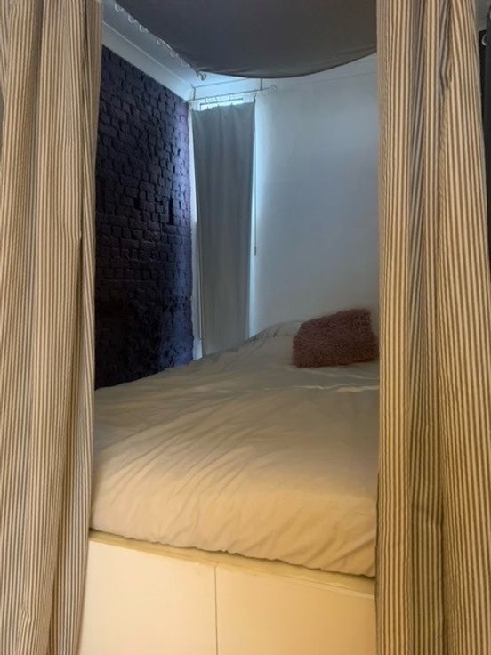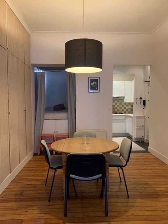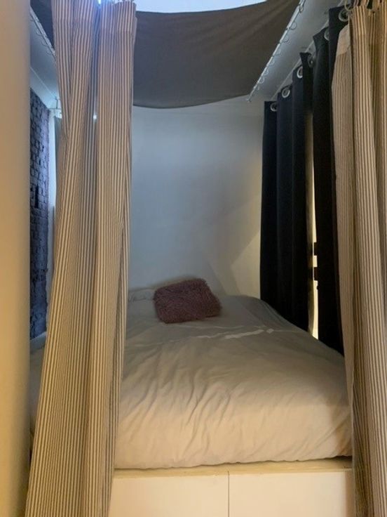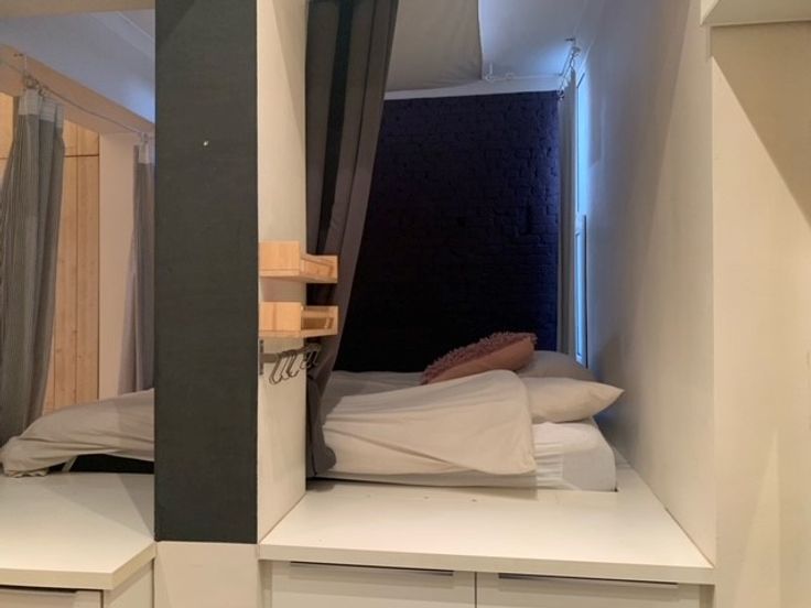 De studio heeft hoge plafonds en voorzien van veel opbergruimte. Er werd een verhoogde slaapruimte gecreëerd die door middel van enkele gordijnen afgesloten kan worden van de leefruimtes.