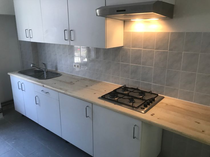 vernieuwde keuken met gasfornuis (opbouw), dampkap en koelkast