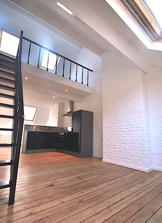 Bel appartement ±60m2, double vitrage, et parquet partout. L'appartement est composé d’un espace ouvert avec salon, salle à manger, cuisine équipée et escalier menant à une chambre sur mezzanine. Salle de bain et local buanderie avec machine à laver installée.