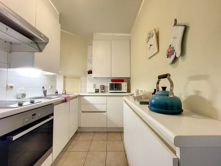 Het appartement zelf is heel aangenaam en voelt ruim aan. Er is een lichtrijke living met ruim terras, een ingerichte keuken, toilet, 1 ruime slaapkamer, badkamer voorzien van douche, lavabomeubel. Er is eveneens een kelderberging en een ondergrondse parkeerruimte (inbegrepen in de prijs).