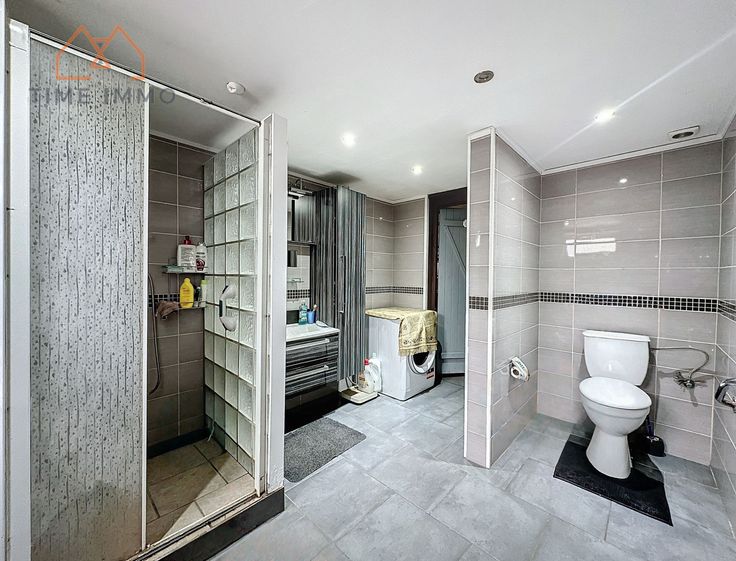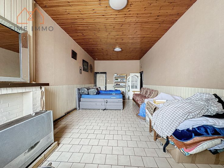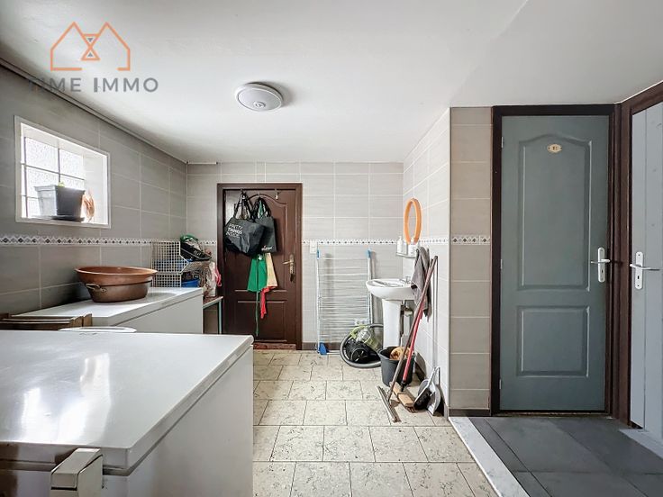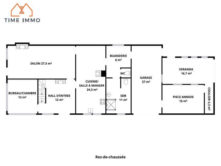 Rez-de-chaussée : Un hall d'entrée menant sur un grand salon, un bureau/chambre, une cuisine/salle à manger, une buanderie, une salle de douche (avec WC), un WC séparé, un garage, une véranda et une pièce annexe