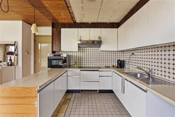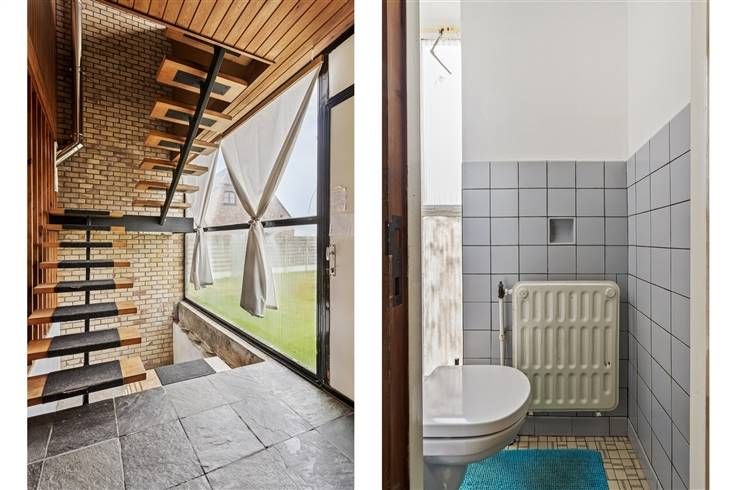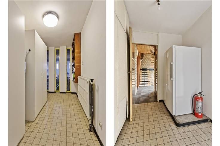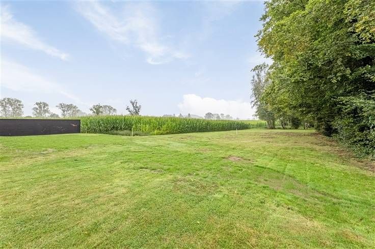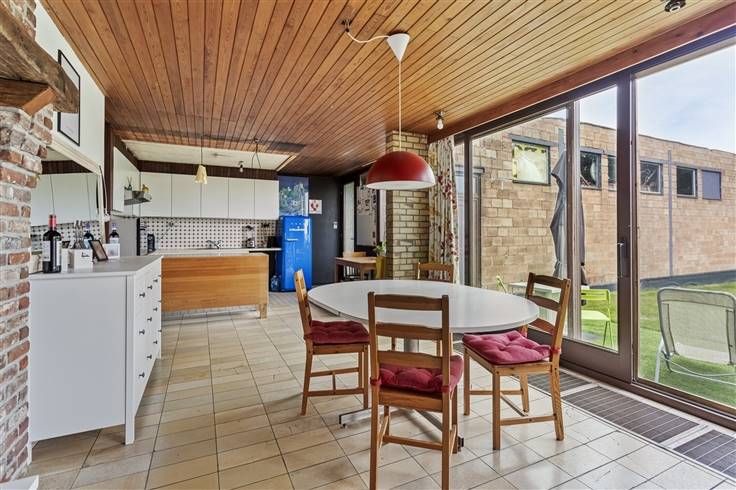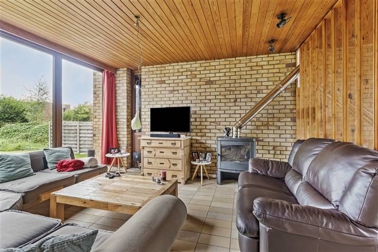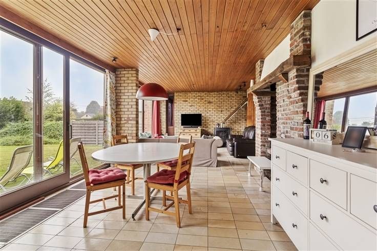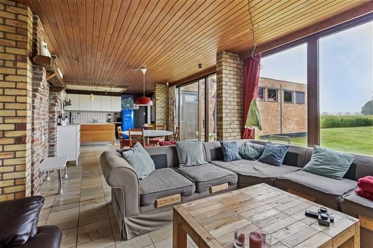 De woning betreden we via de inkomhal, met hier ook een apart toilet en een berging. Daarna komen we binnen in de mooie leefruimte met open keuken (samen 43,75 m²). Van hieruit heb je steeds een open zicht op de grote zuidgerichte tuin met achterliggende velden.
