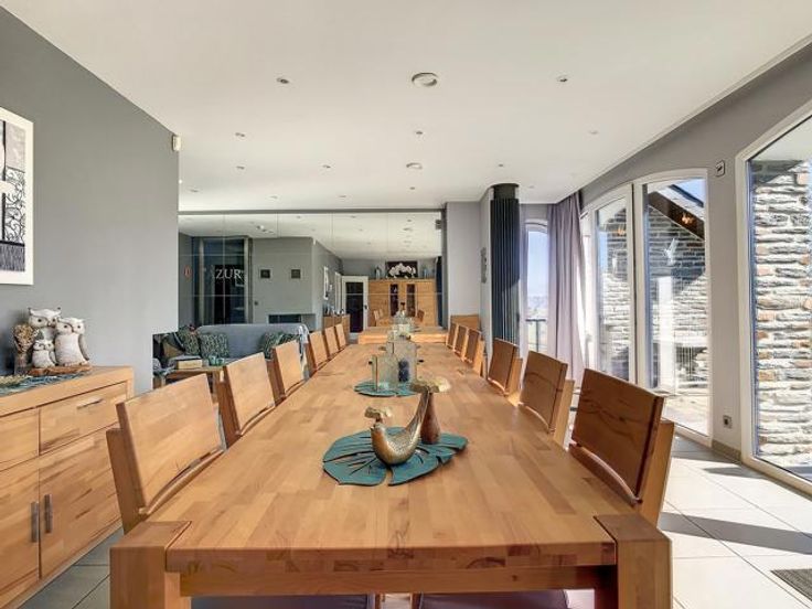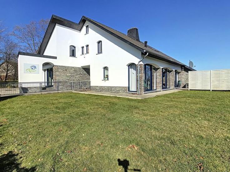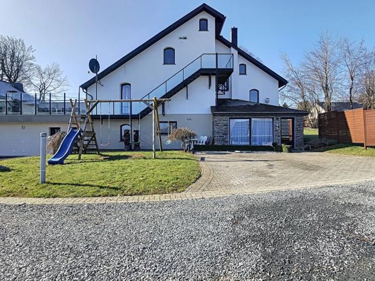 I.P.A. biedt u een uitzonderlijk eigendom aan dat bestaat uit een villa (vakantiehuis of villa voor ruiters) en een appartement. Profiteer van een rustige omgeving met een panoramisch uitzicht op een prachtig landschap dat typisch is voor de Hoge Venen. De villa van 336m² is als volgt samengesteld: Op de begane grond, een ruime woonkamer, een volledig uitgeruste keuken, een eetkamer, een ontspanningsruimte met open haard en verwarmingskolommen voor een zeer gezellige sfeer open naar het terras dankzij een grote erker. Op de eerste verdieping zijn er 4 mooie en lichte slaapkamers uitgerust met een wastafel, evenals een badkamer en twee doucheruimtes. Op de bovenste verdieping is er een ruimte met zes bedden. Op tuinniveau bevindt zich een prachtige wellnessruimte met sauna, stoombad, infraroodcabine en een heerlijke zoutgrot evenals 2 doucheruimtes. Een ontspanningsruimte met een pooltafel, tafelvoetbal en darts. Een appartement van 94m² met twee grote slaapkamers, ideaal voor gasten. Buiten, een terras met stenen BBQ en een tuin van 230m². De achterzijde van het gebouw, bereikbaar via een oprit waar een tiental auto's geparkeerd kunnen worden, geeft u toegang tot een buitenruimte van 1050m². U vindt er ook een magazijn van 90m². Het kan ook worden gebruikt als paardenbox. Het pluspunt? Het eigendom beschikt over een uitgestrekte weide van 8600m². De gebouwen worden gevoed door 40 fotovoltaïsche panelen en 5 thermische panelen.