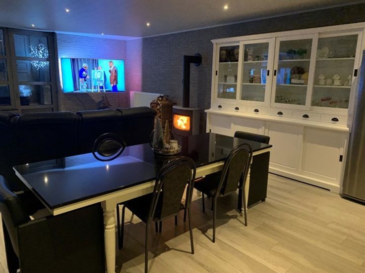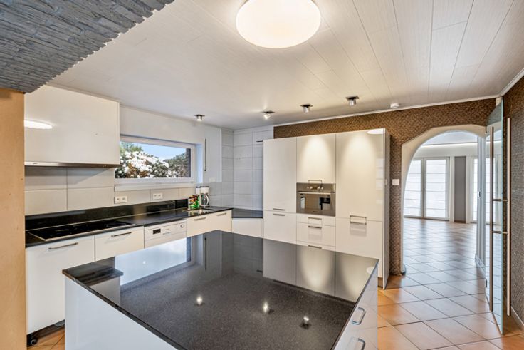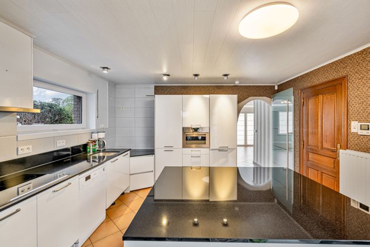 De villa heeft een bewoonbare oppervlakte van maar liefst 250 m² en omvat een inkomhal, apart toilet, bureau, ruime woonkamer en eetkamer met aansluitende, volledig ingerichte eiken keuken. Deze keuken biedt toegang tot een extra aanbouw die bestaat uit een woonkamer en eetkamer.