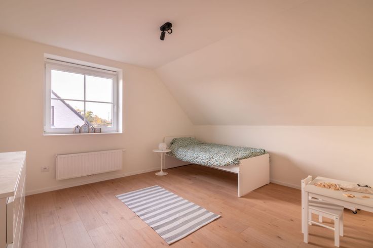 Op het gelijkvloers vind je een inkomhal met gastentoilet, een lichtrijke leefruimte met open keuken alsook bergruimte terug. Op de bovenverdieping vind je drie ruime slaapkamers en een badkamer die is uitgerust met een bad, douche en een dubbele lavabo. De woning omvat vloerverwarming op de benedenverdieping en convectoren op het verdiep. Verder beschikt deze ook over een ruime zolder die kan ingericht worden als stockageruimte.
