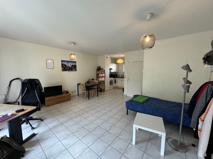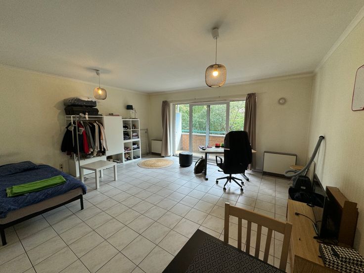 Très agréable studio spacieux (45m2 - pas de chambre séparée) situé sur la place de l'équerre au calme comprenant un séjour comprenant le coin sàm-salon-lit avec cuisine équipée (four, taques, hotte, évier, frigo mais pas de lave-vaisselle) ainsi qu'une salle de bains avec wc et agréable terrasse orientée Sud-Est. Présence d'une cave. Bon PEB : C. Disponible au 01/10/2024. Bail d'un an renouvelable. Parking public sur la place de l'équerre + parking non extérieur appartenant à l'immeuble.