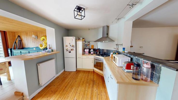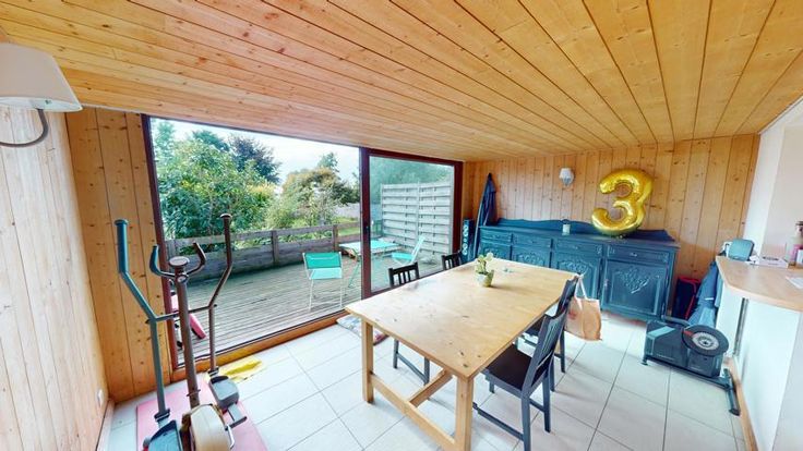 Op de 1e verdieping, een woonkamer van 44 m² met open keuken, een wasruimte, een toilet en een eetruimte van 28 m² die uitkomt op een terras van 15 m², gericht op het zuidoosten, samen met een perceel van 430 m².