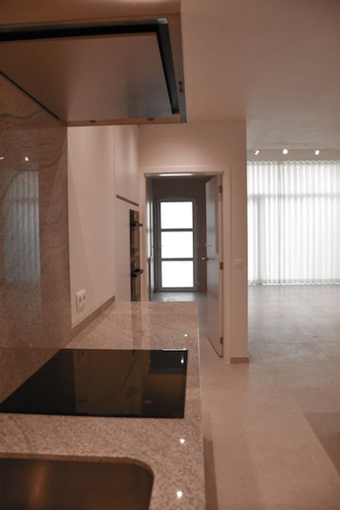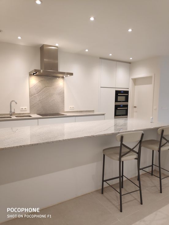 Er is een grote open leefruimte met veel lichtinval. De keuken heeft de gebruikelijke keukentoestellen: afwasmachine, microgolf, heteluchtoven, ijskast, diepvries, inductie kookvuur. Heel leuk is ook het keukeneiland met zitgedeelte.