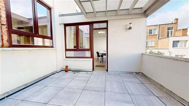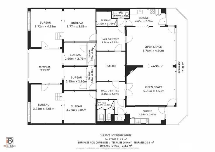 1er étage : 2 hall d'entrée indépendants (+/-10 et 9 m²), 6 espaces bureaux dont 2 vitrés avec isolation acoustique (de +/- 7,5 m² à 17 m², sols vinyle), 1 grand bureau en "open space" (+/-53 m², sol parquet) avec accès à la terrasse (façade avant), 2 cuisines équipées (2x +/-9 m², avec four, taque, hotte, frigo, lave-vaisselle), 1 espace buanderie (+/- 4m²) et 4 toilettes.