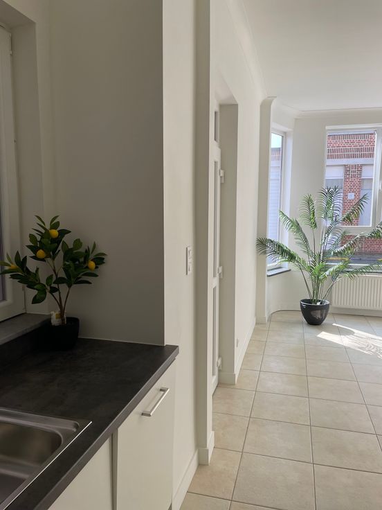 Centraal gelegen appartement te huur Volledig vernieuwd appartement met living, geïnstalleerde keuken (oven, dampkap, vaatwas, ijskast, spoelbak en voldoende kastruimte), eetkamer, slaapkamer, badkamer met douche, apart toilet en bergruimte. Onmiddellijk beschikbaar.