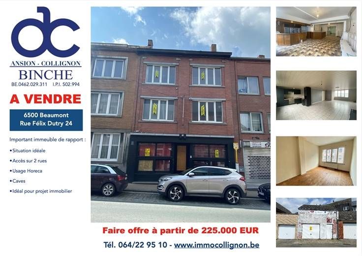 Sorry er is geen nederlandse vertaling beschikbaar. À vendre, Beaumont, important immeuble de rapport idéalement situé au centre-ville offrant un accès sur deux rues. Se composant au rez-de-chaussée d’une surface commerciale lumineuse avec vitrines anciennement à usage d’Horeca : grande salle de réception, sanitaires donnant sur une cour extérieur et garage. Les étages se composent sur trois niveaux offrant d’importantes superficies au sol permettant aisément l’aménagement de plusieurs entités et/ou appartements moyennant les autorisations urbanistiques nécessaires. Caves. Idéal pour projet immobilier et/ou immeuble de rapport. Le tout sur 1 are 86 ca. Faire offre à 225.000 EUR. Visites et renseignements au 064/229510.